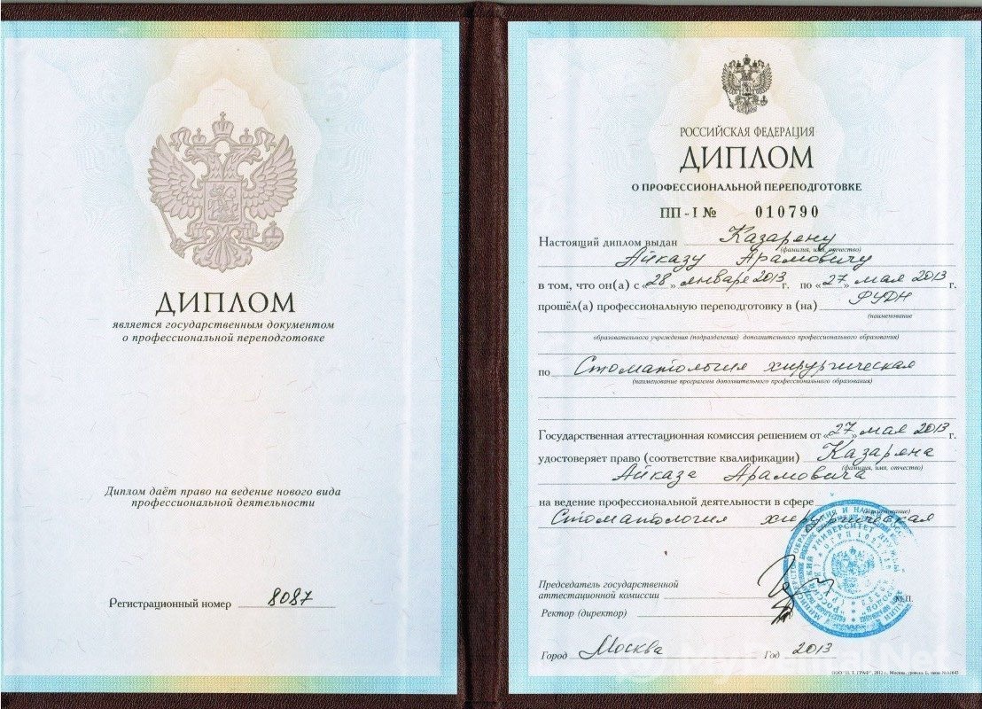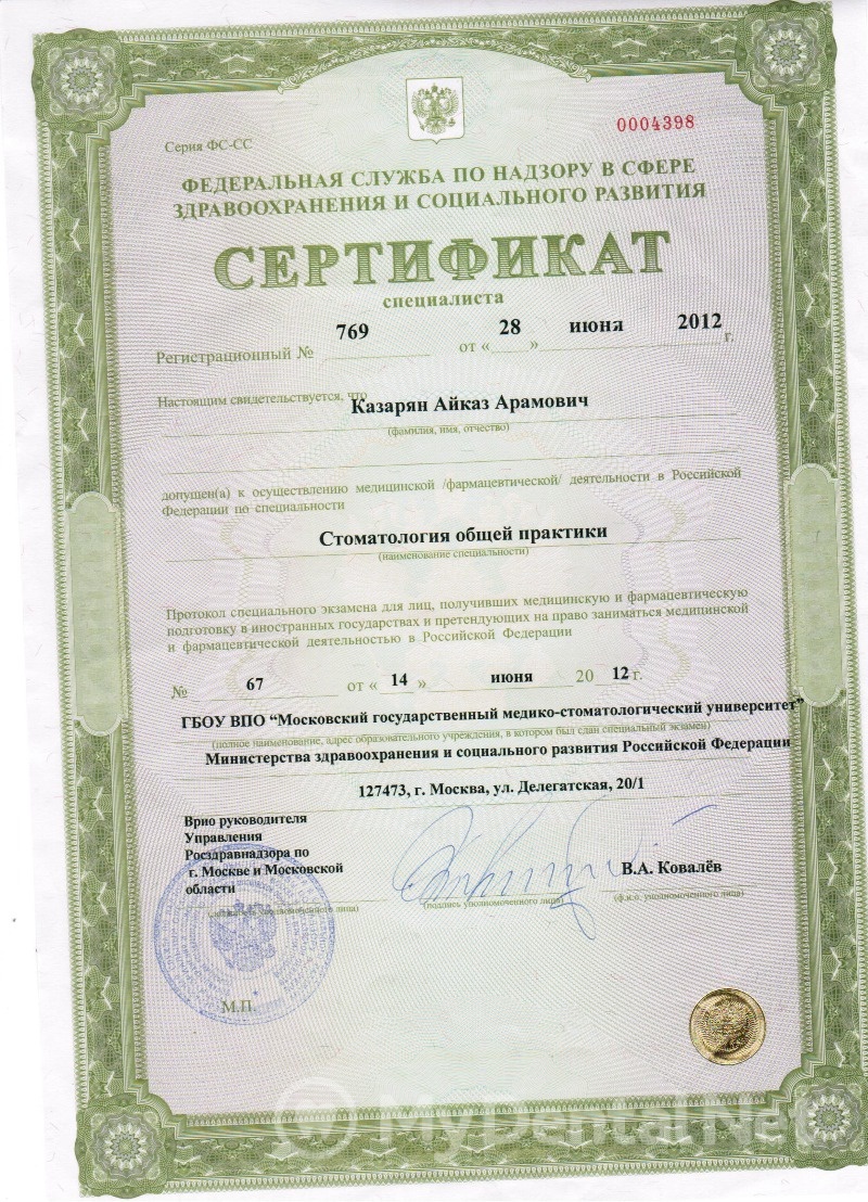 • Сертификат и удостоверение об успешном окончании обучения в целевой клинической ординатуре на кафедре госпитальной терапевтической стоматологии МГМСУ.
