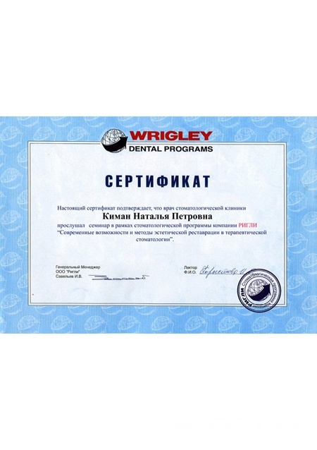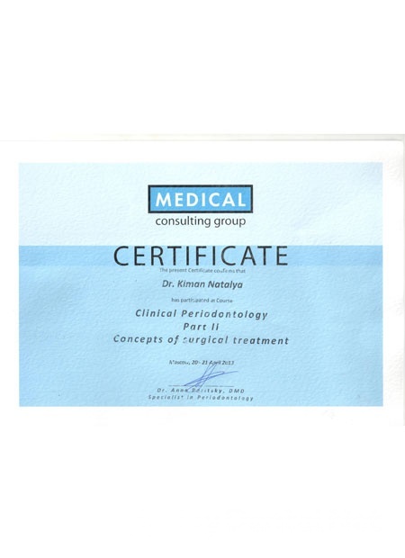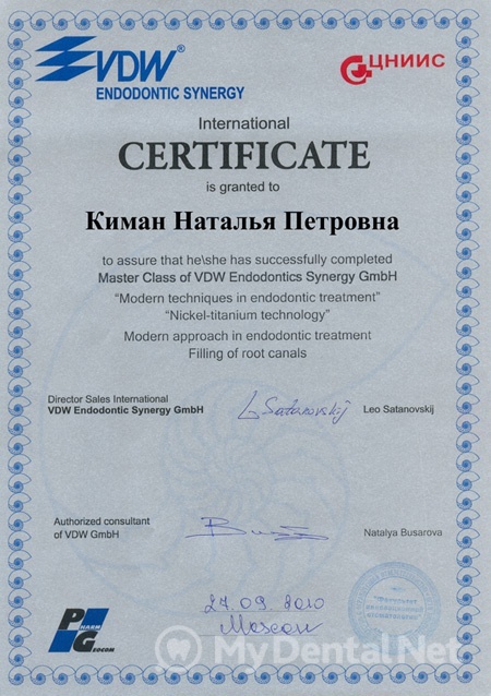 В 1997 г. закончила Минский Государственный Медицинский Институт. Специализация терапевтическая стоматология. Прошла стажировку и работала врачом стоматологом-терапевтом на базе государственной стоматологической клиники. С 2004 г. работает в частной стоматологии врачом стоматологом-терапевтом. С 2006 г. прошла стажировку по хирургической стоматологии на базе стоматологического отделения Гродненской ОКБ. С 2006 г. после прохождения стажировки работала в государственной стоматологической поликлинике и стационаре стоматологом-хирургом. В период с января по июль 2007 г.прошла курс переподготовки по хирургической стоматологии на базе института повышения квалификации врачей и получила диплом врача стоматолога-хирурга. С 2007 г. по настоящее время практикует в частной стоматологии в должности стоматолога-терапевта и хирурга. .
