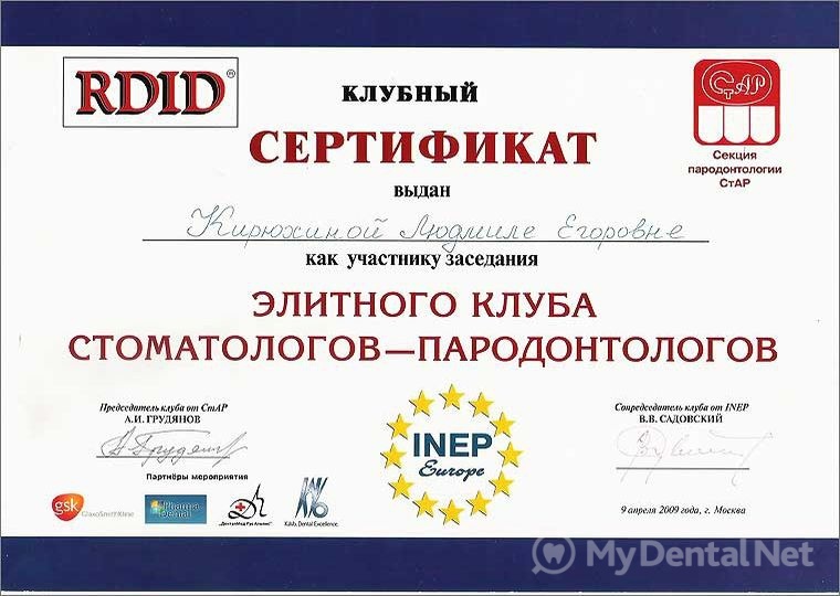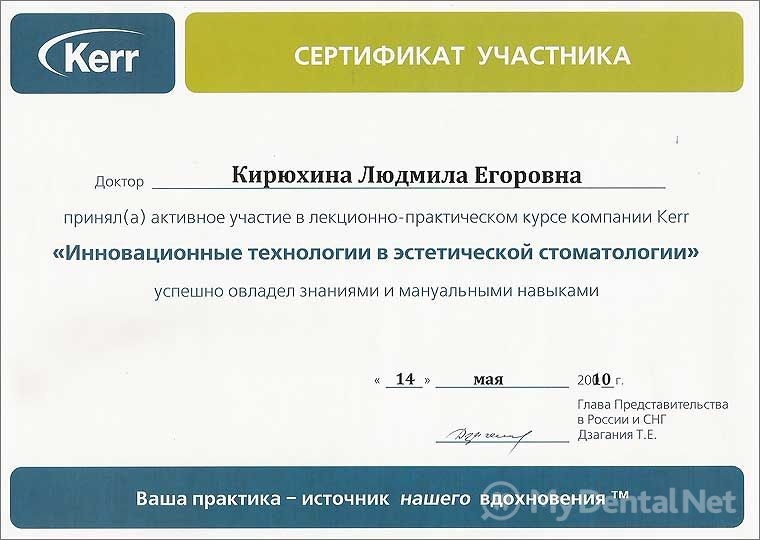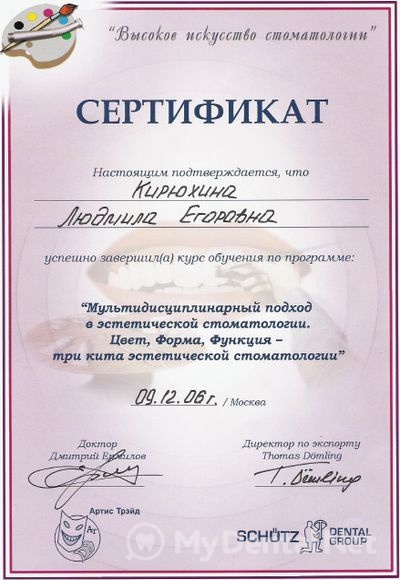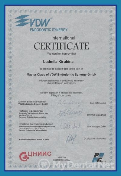 Квалификация: Клиническая интернатура (МГМСУ, кафедра стоматологии общей практики), Сертификат Артис-Трейд “Эстетическая стоматология. Междисциплинарный подход. Цвет, форма, функция”, International Certificate VDW Endodontic Synergy ” Modern approach in endodontic treatment. Problems of retreatment. Tooth restoration after endodontic treatment”, International Certificate VDW Endodontic Synergy (Master class) “Modern techniques in endodontic treatment. Nikel-titanium technology. Filling of root canals”, Сертификат 3M ESPE обучения по программе “Авторская методика моделирования фронтальной и боковой группы зубов. Клинические аспекты моделирования коронковой части зуба с применением техники Mock-up”, сертификат компании Kerr (научно-практический курс “Инновационные технологии в эстетической стоматологии”), участник элитного клуба Стоматологов-пародонтологов (RDID, клубный сертификат СтАР).
