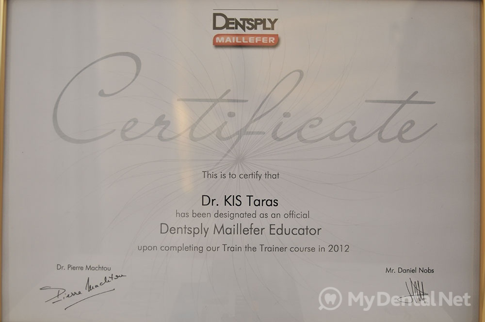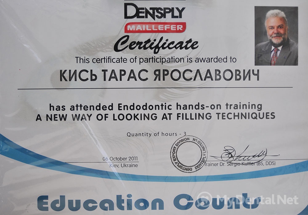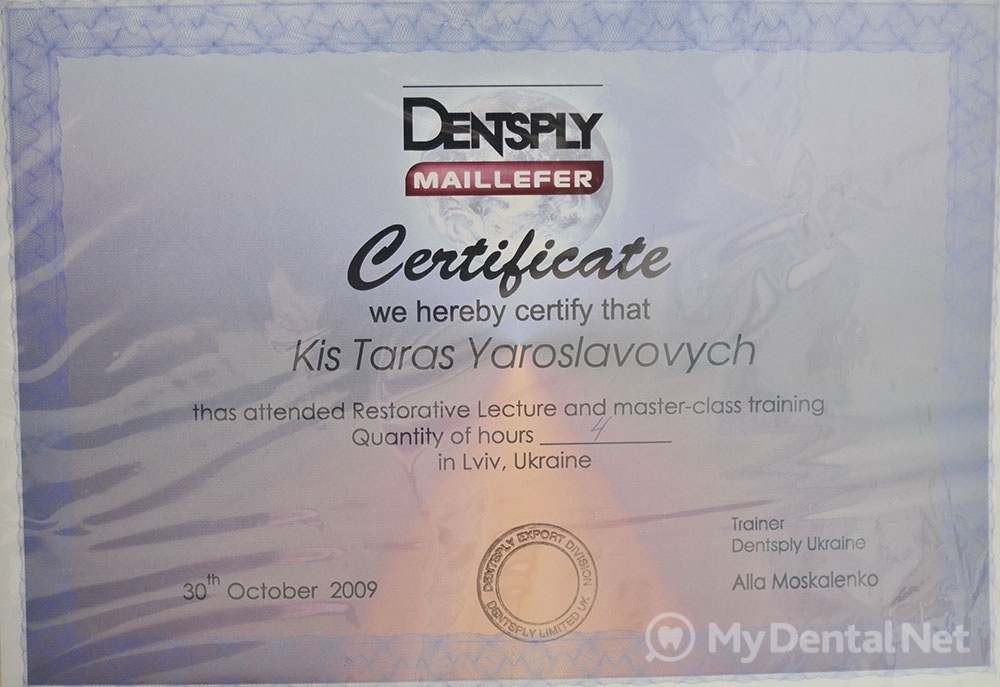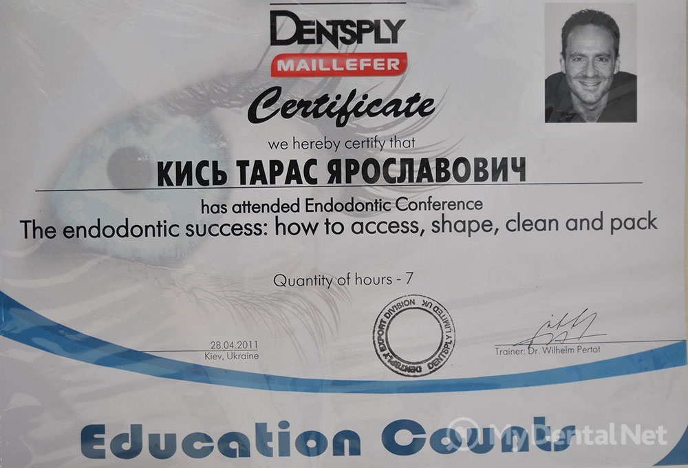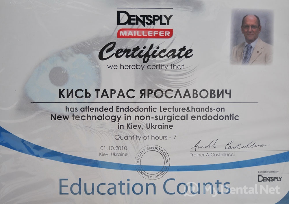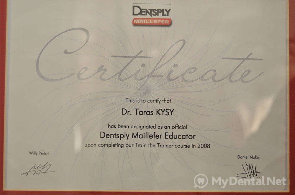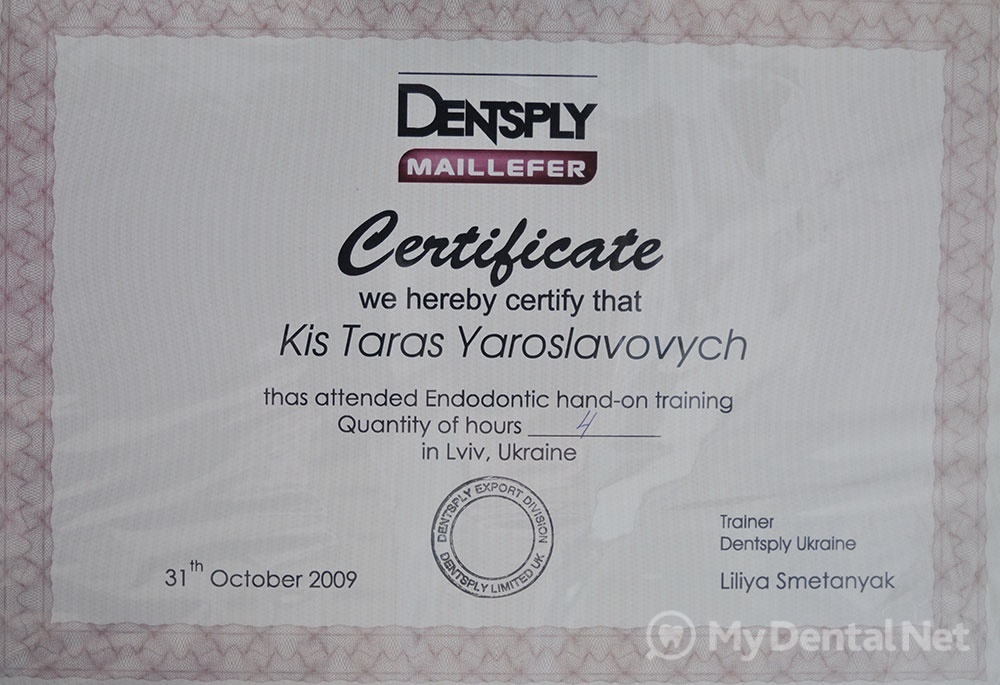 Сертифицированный тренер компании Dentsply Maillefer (эндодонтия). Проходил обучение в Швейцарии (Maillefer, под руководством проф.П.Машту).