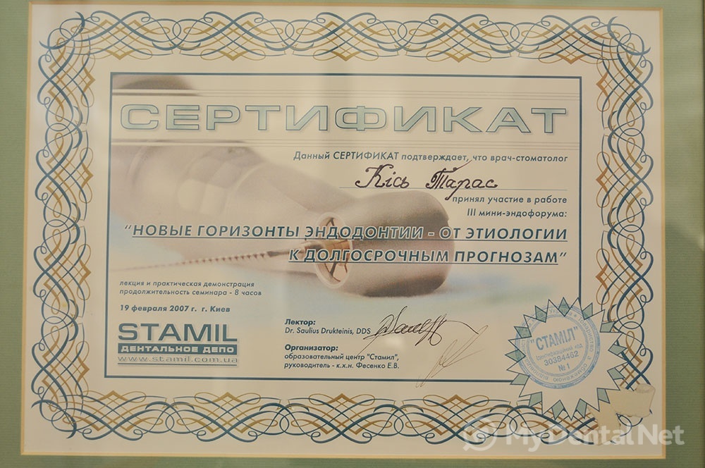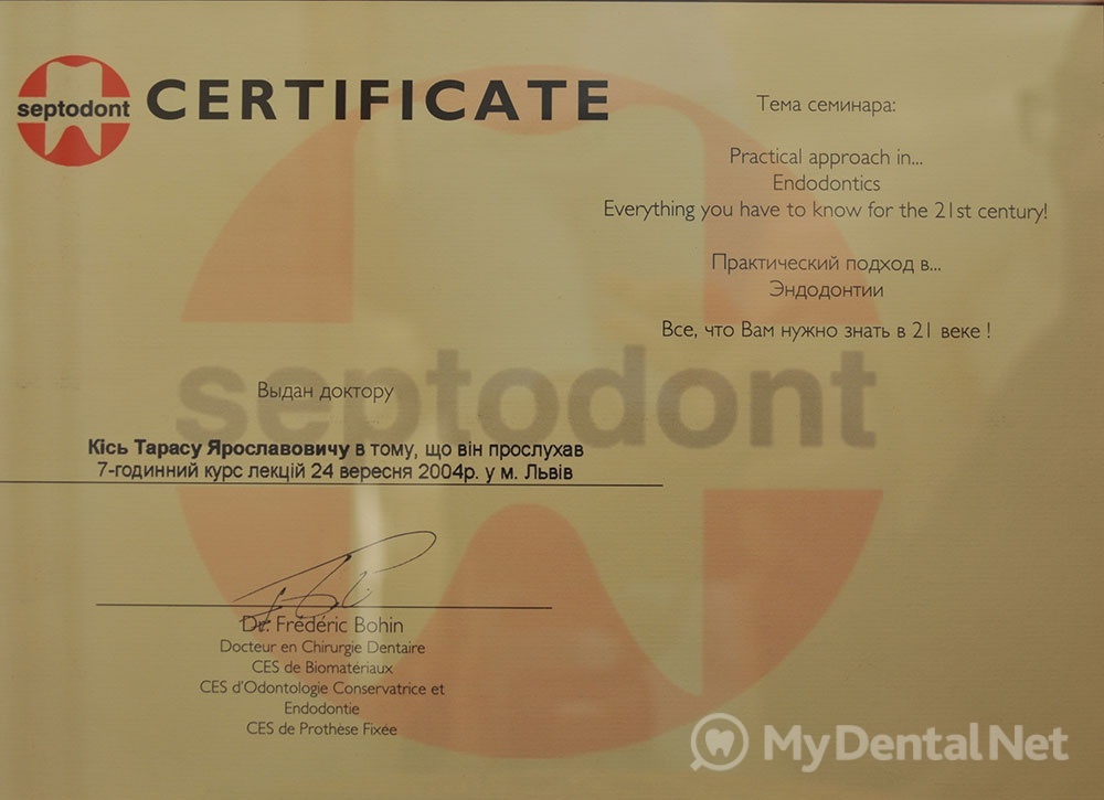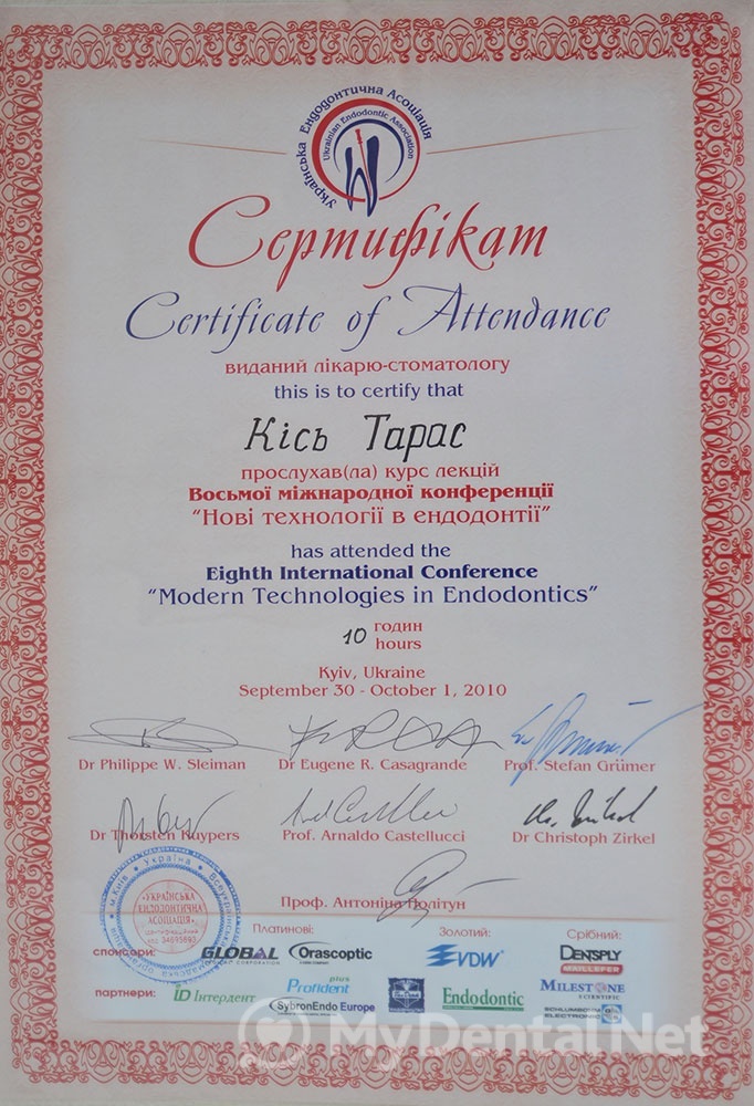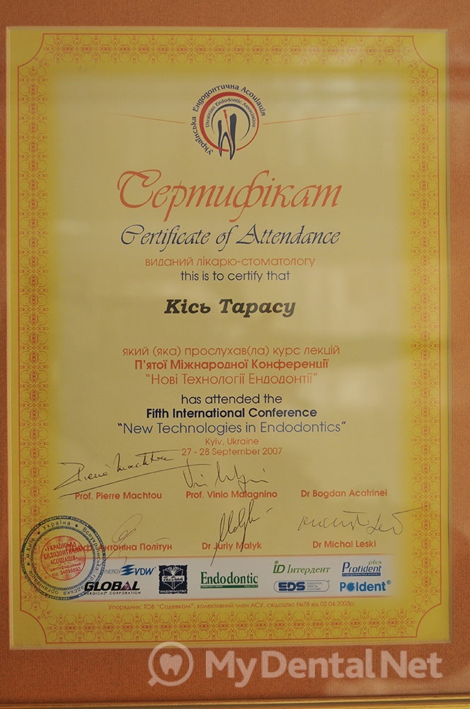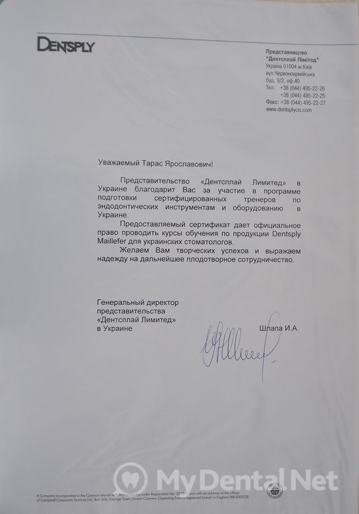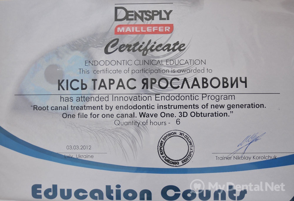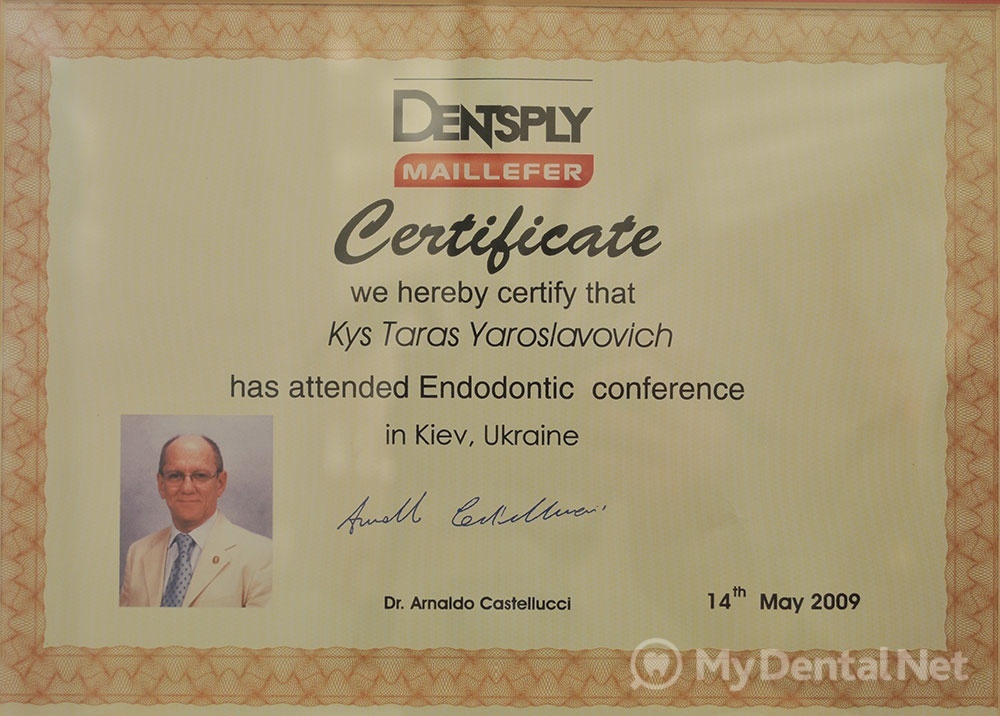 Сертифицированный тренер компании Dentsply Maillefer (эндодонтия). Проходил обучение в Швейцарии (Maillefer, под руководством проф.П.Машту).