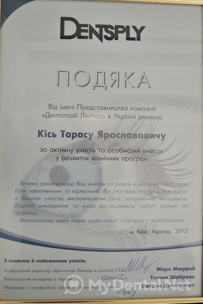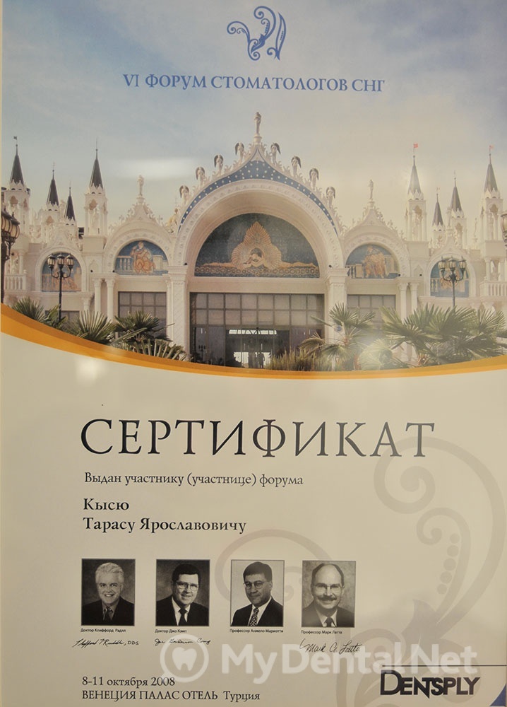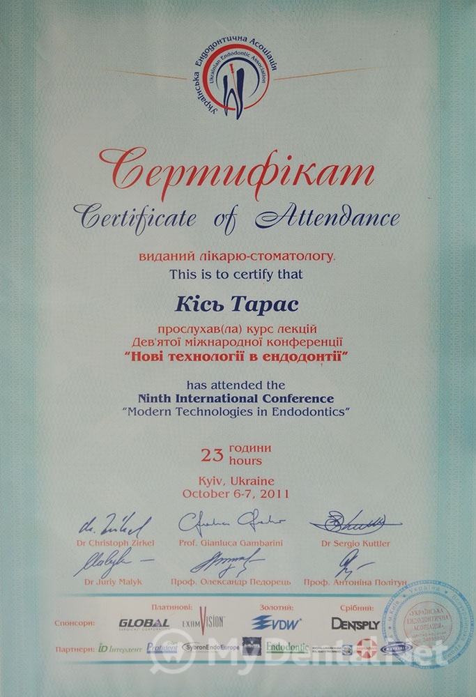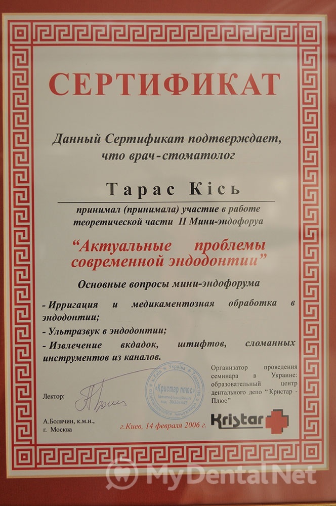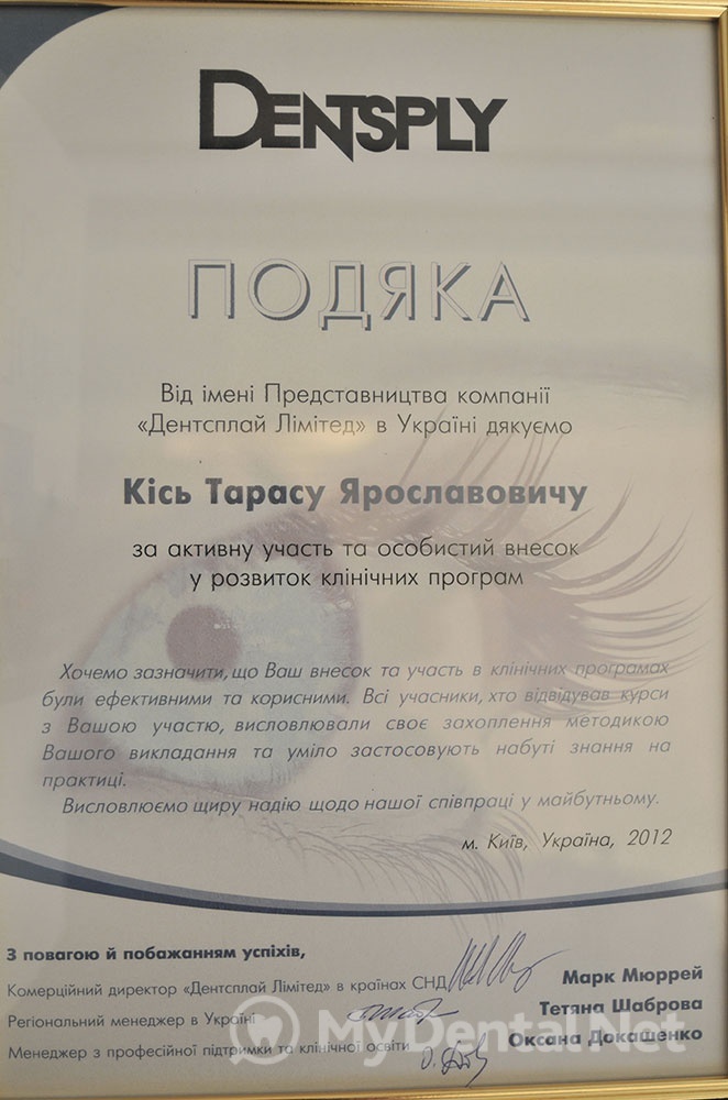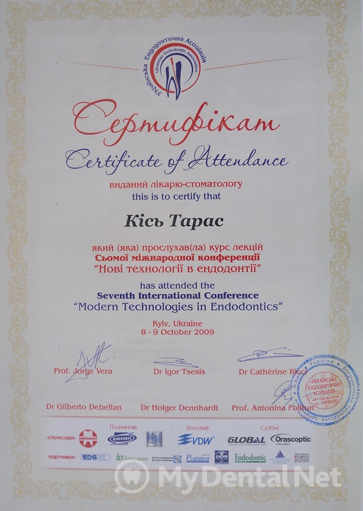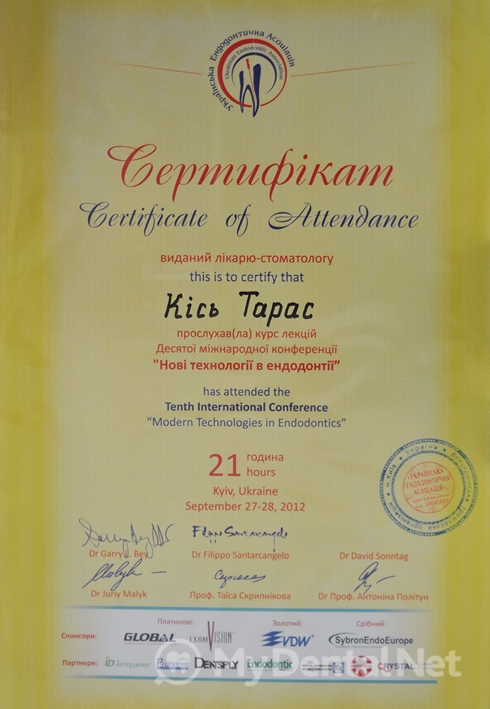 Сертифицированный тренер компании Dentsply Maillefer (эндодонтия). Проходил обучение в Швейцарии (Maillefer, под руководством проф.П.Машту).