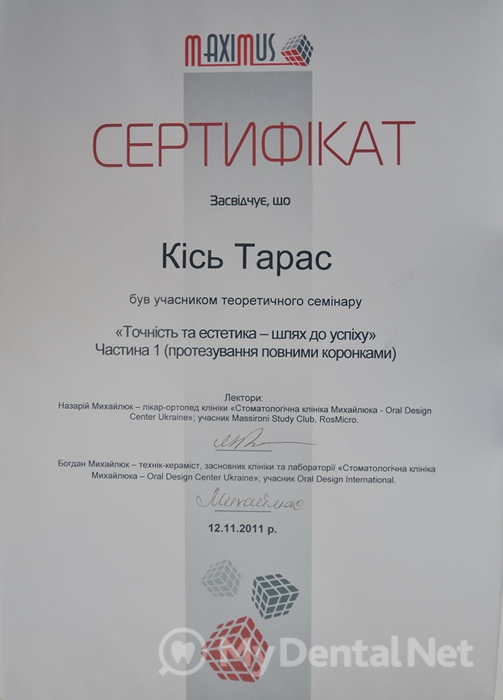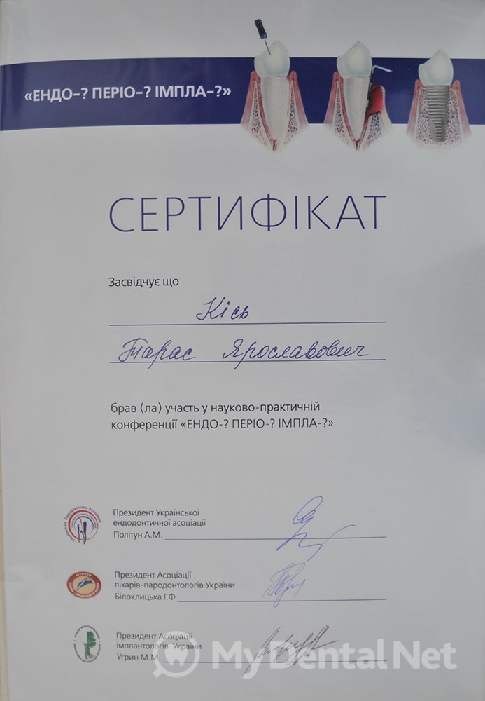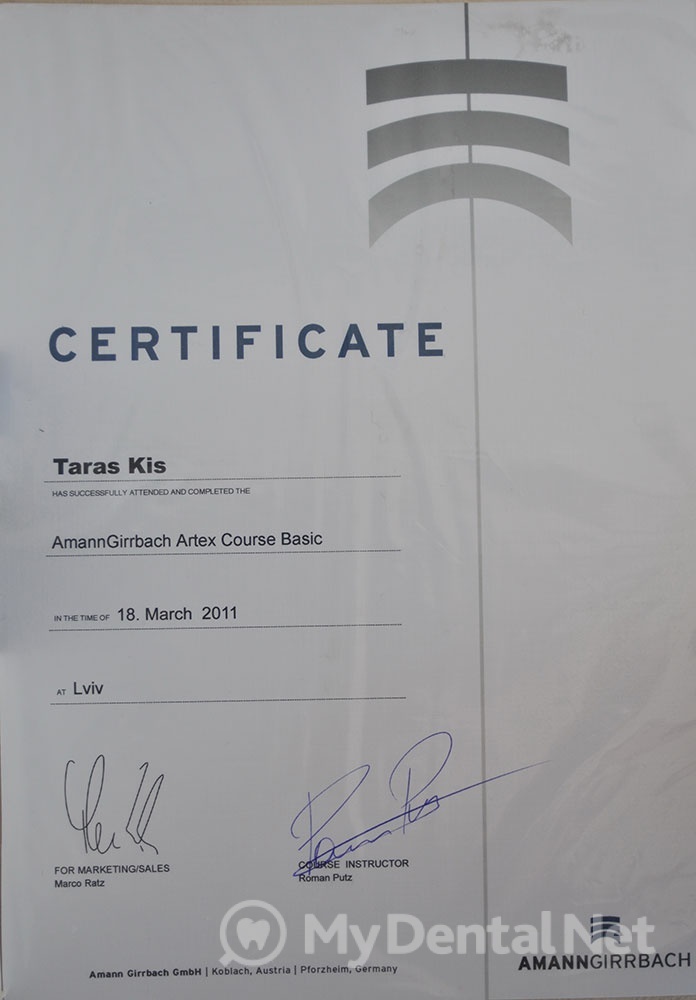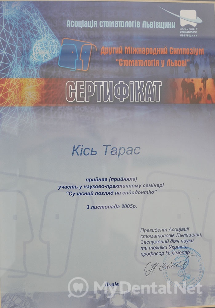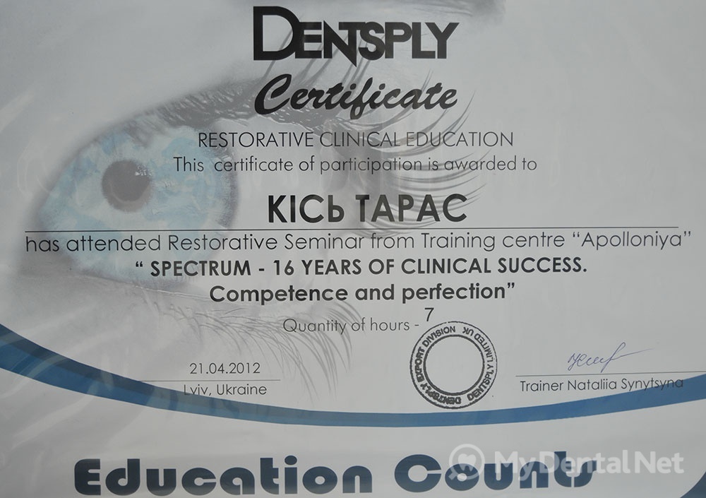 Окончил ЛНМУ им. Галицкого в 2004г., Специализация общая и терапевтическая стоматология.