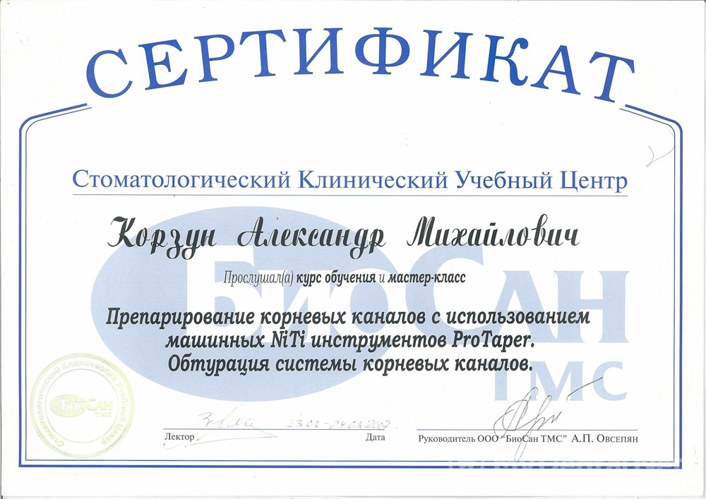 2007 — Курс и мастер-класс «Препарирование корневых каналов с использованием машинных NiTi инструментов Pro Taper. Обтурация системы корневых каналов»
