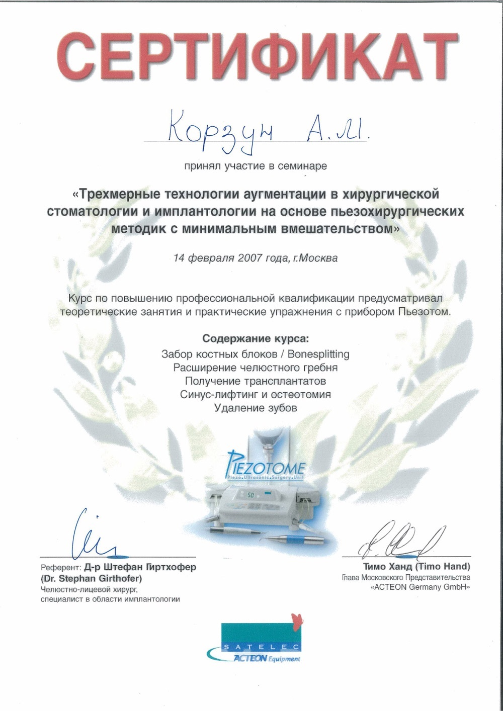 2007 — Курс «Трехмерные технологии аугментации в хирургической стоматологии и имплантологии на основе пьезохирургических методик с минимальным вмешательством»
