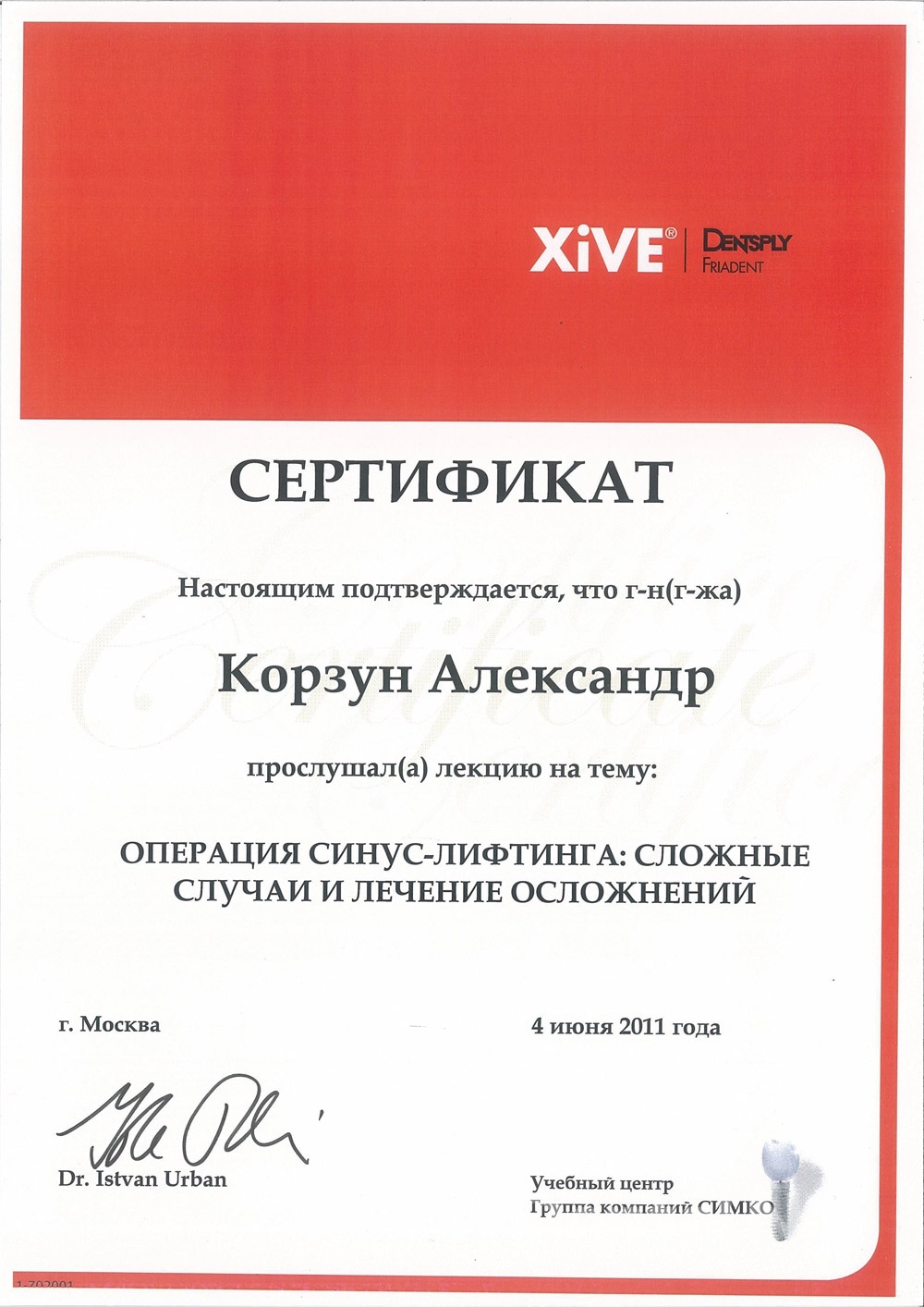 2012 — Курс «Операция синус – лифтинга: сложные случаи и лечение осложнений».