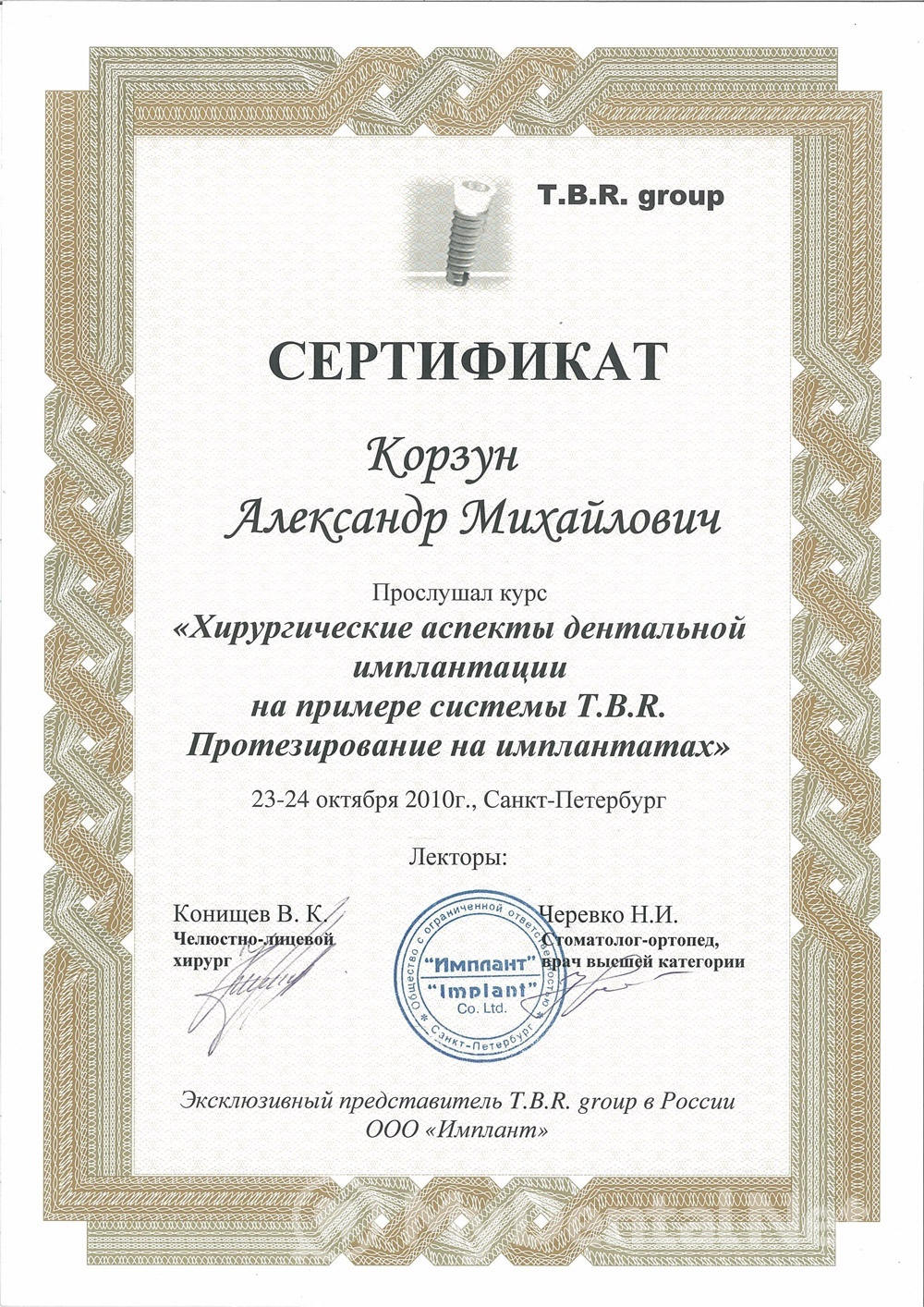 2010 — Курс «Хирургические аспекты дентальной имплантации на примере системы TBR. Протезирование на имплантатах»