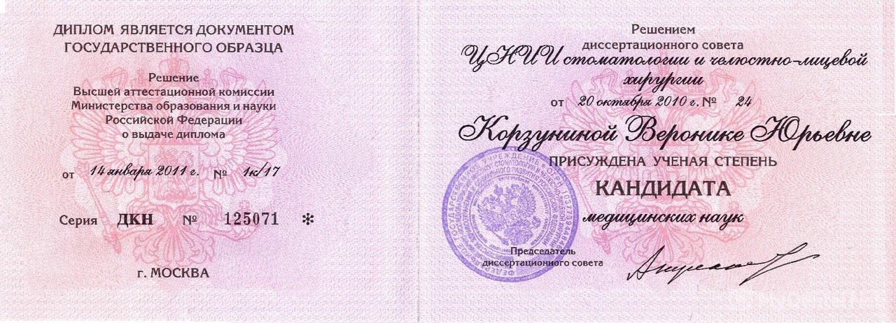 2010 г. - Защита кандидатской диссертации по теме «Дифференцированное использование новых медикаментозных препаратов на различных этапах лечения воспалительных заболеваний пародонта» ЦНИИС и ЧЛХ г.Москва