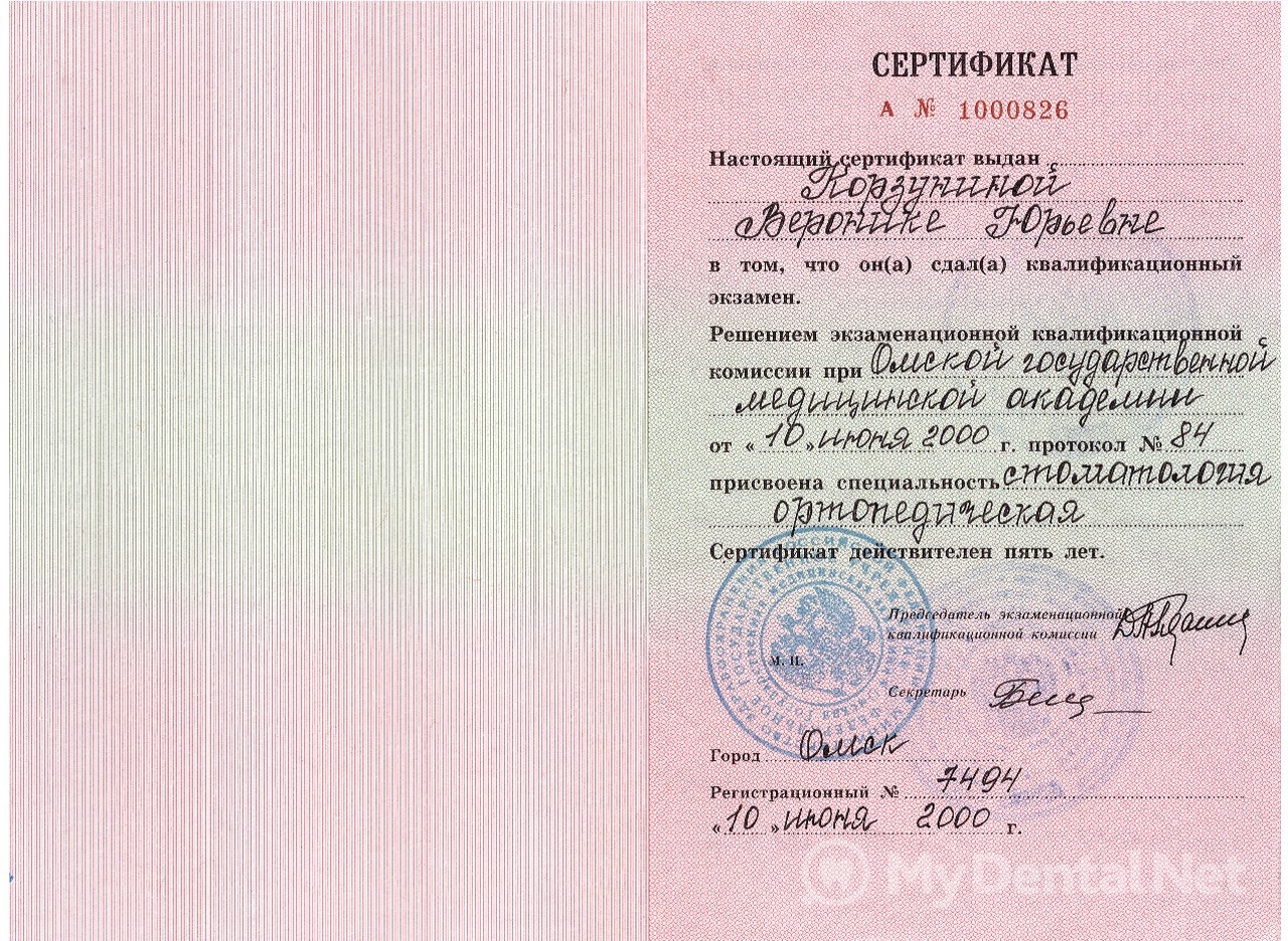 2000 г. – Курсы повышения квалификации по ортопедической стоматологии ОГМА, ЦПДО