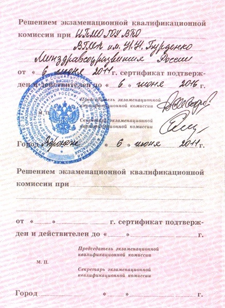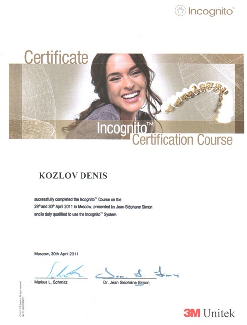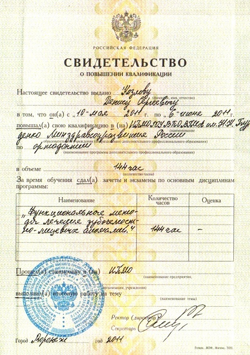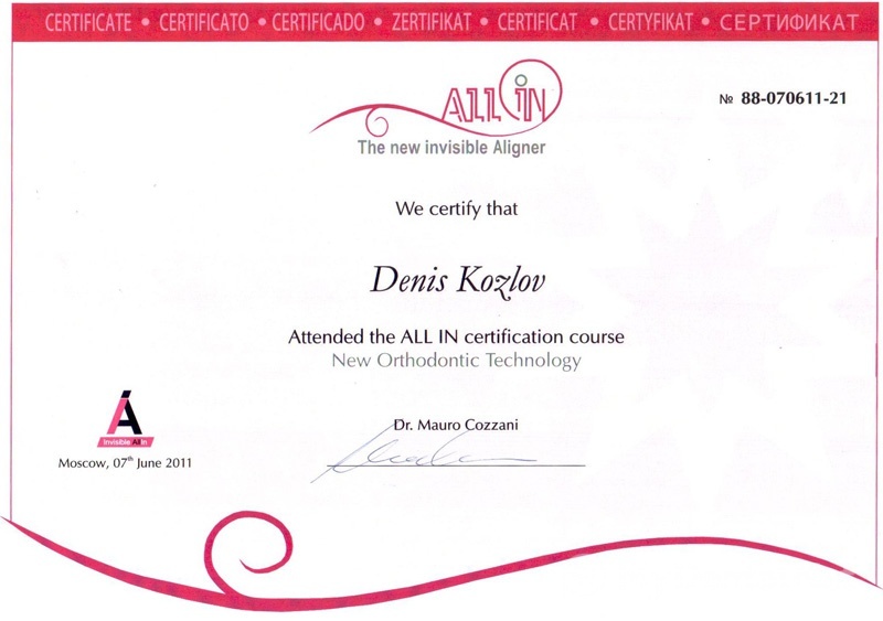 Прошел сертификационные курсы повышения квалификации: «Физиологические и клинические аспекты лечения технологией ультраслабых сил», «Самолигирующиеся брекеты», «Эффективное использование лингвальных брекет-систем в практике врача-ортодонта».