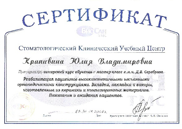 Сертификат "Реабилитация пациентов высокоэстетичными несъемными ортопедическими конструкциями. Вкладки, накладки и виниры, изготовленные из керамики и композиционных материалов. Пожелания и ожидания пациентов." Стоматологический Клинический учебный центр "Биосан" 29-30 апреля 2009 года.