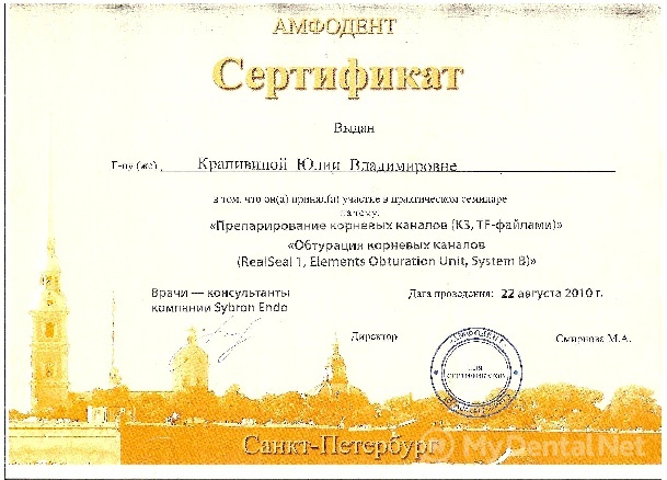 Сертификат по специальности "Эндодонтия" выдан учебным центром "Амфодент" 22 августа 2010 года.