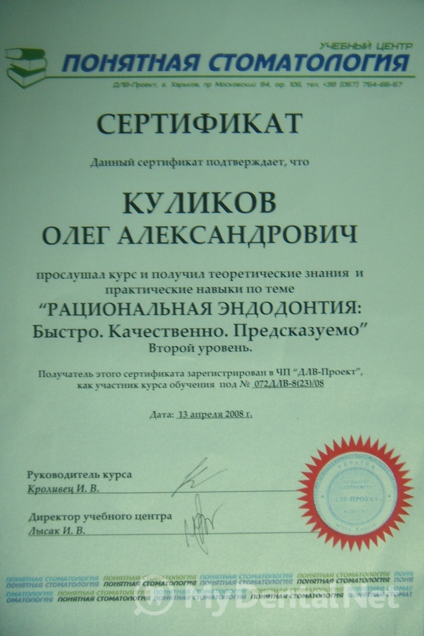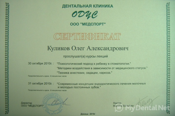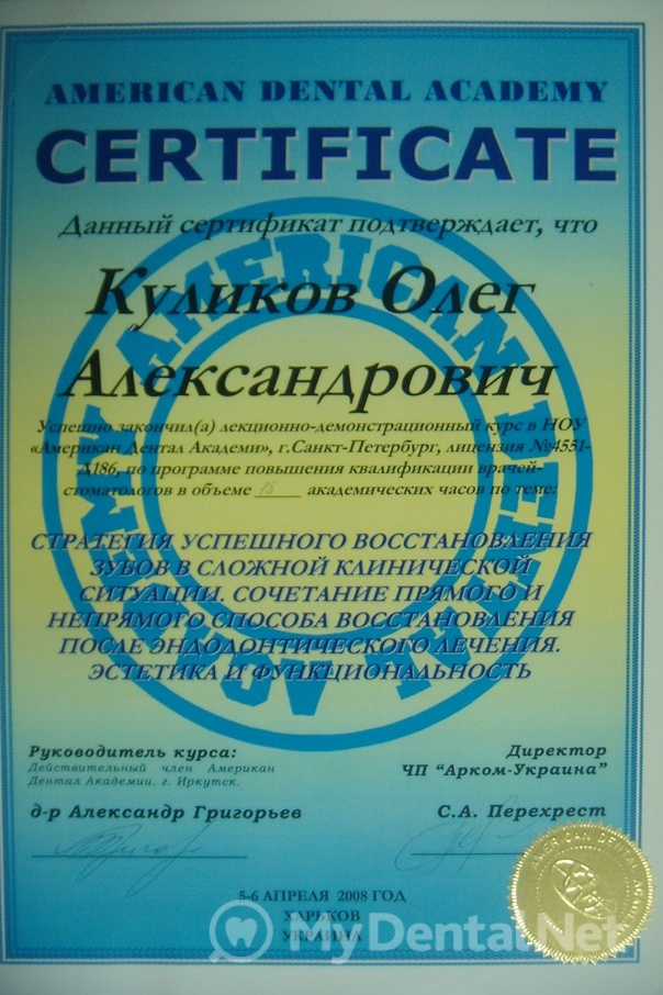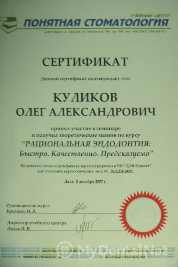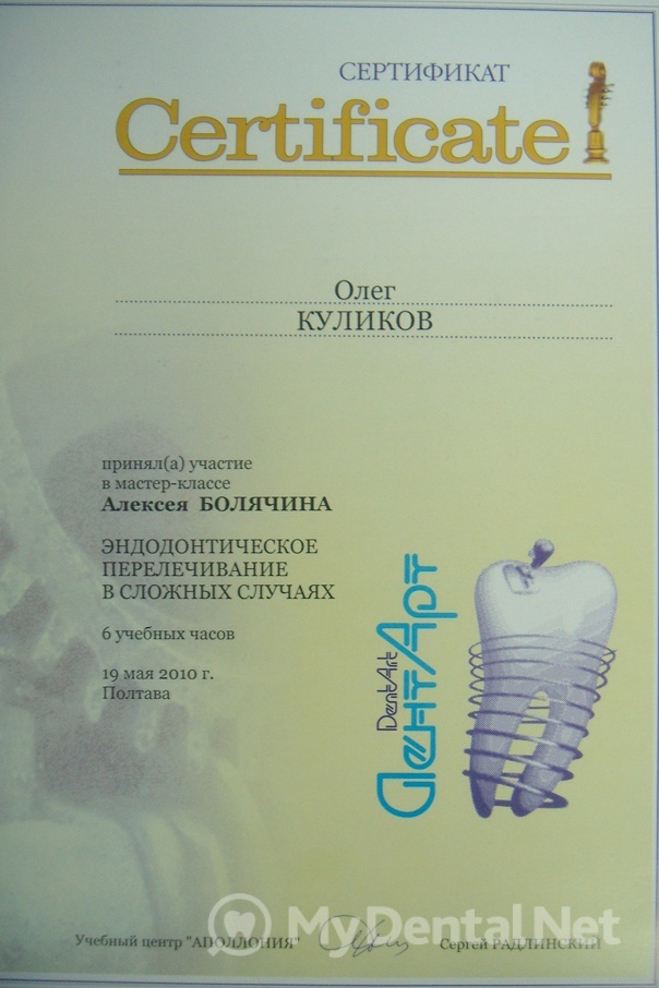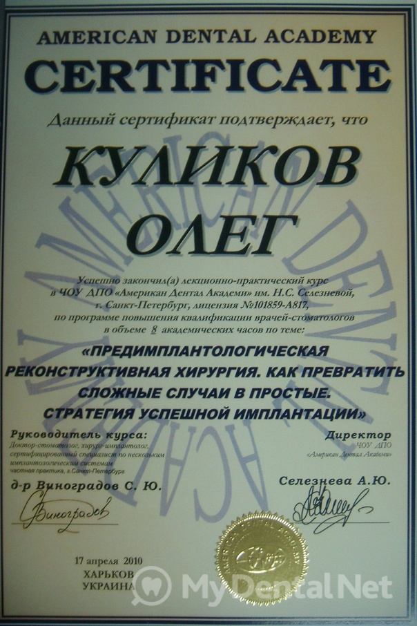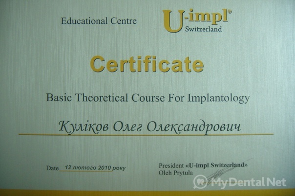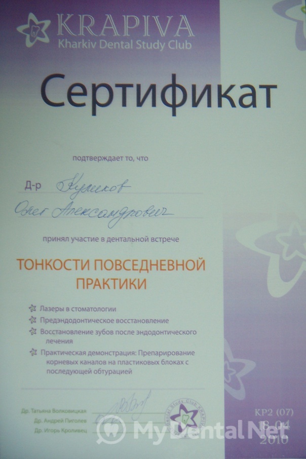 Окончил Харьковский Национальный Медицинский Университет. С 2007г.- ученик ведущего стоматолога страны Д.В.Скалозуба. С 2008г. заведующий отделением детской терапии и эндодонтии одной из элитных клиник г.Харькова. Обучался на курсах повышения квалификации ведущих стоматологов Украины, России, Германии, Израиля. Специализация: «Ортопедическая стоматология» , «Имплантологии», «Общая стоматология» (Междисциплинарный подход). Дипломы по эндодонтии, реставрации, имплантологии, микропротезированию. В совершенстве владеет техникой прямых художественных реставраций, трехмерной пломбировки корневых каналов. Большой опыт работы с операционным микроскопом. Легко находит подход к детям. Интересуется эстетическим протезированием, пародонтологией, отбеливанием, имплантологией. Женат, трое детей. Увлекается живописью, фортепиано.