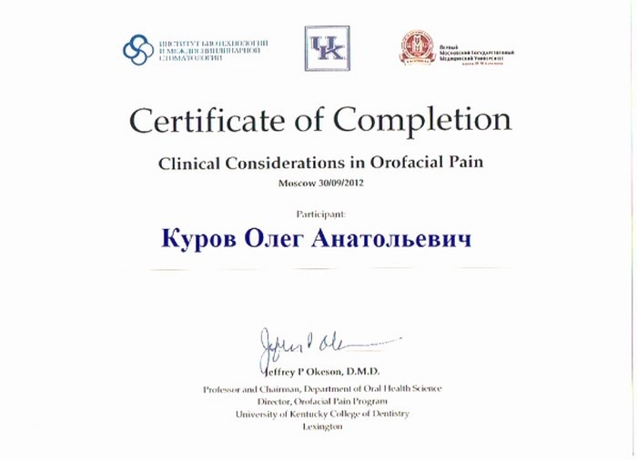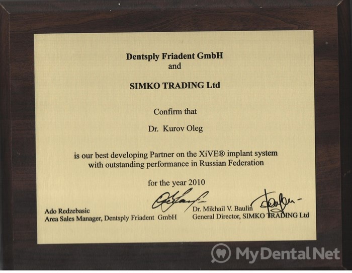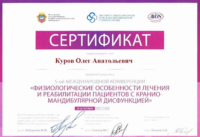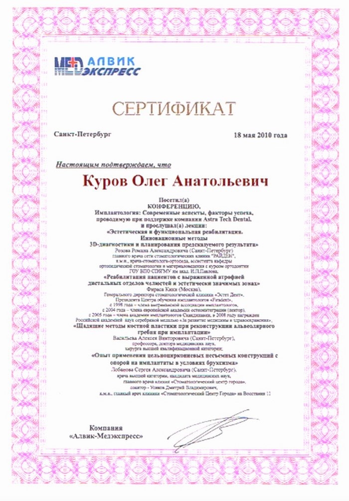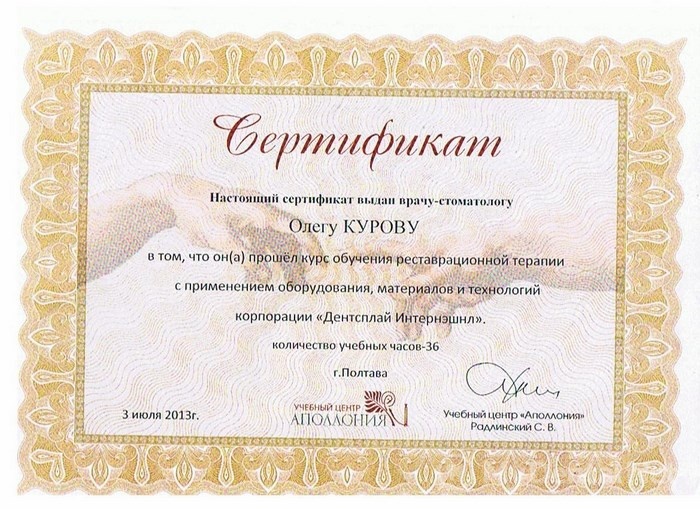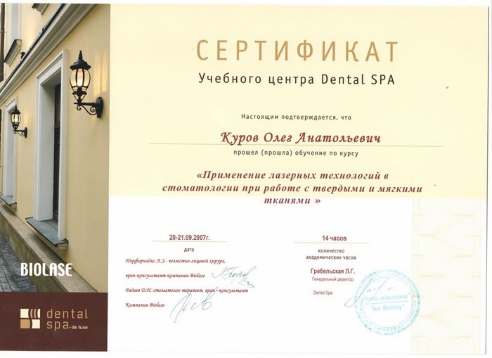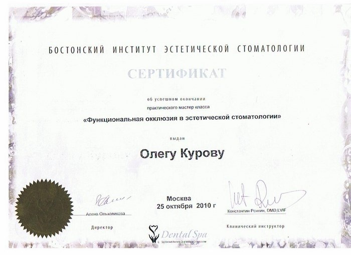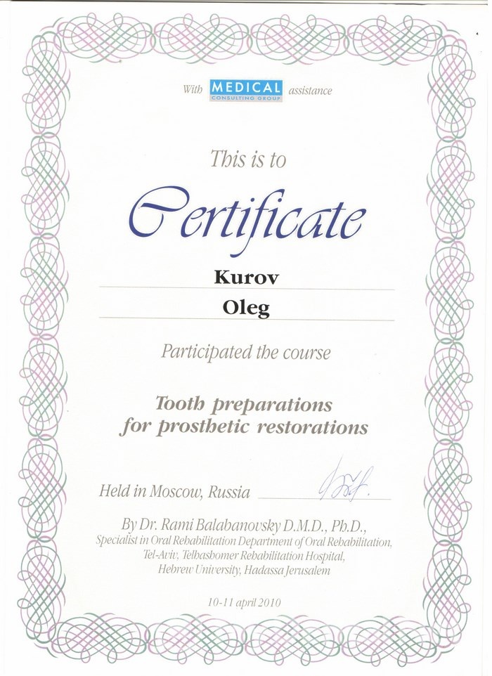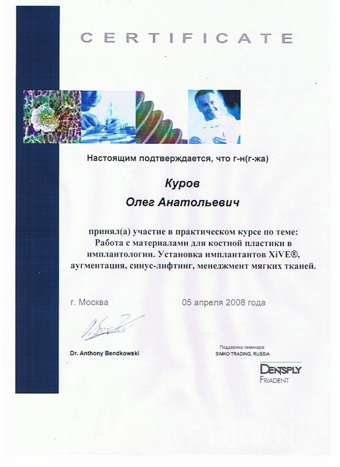 2008г. – Курсы «Костная пластика, пластика мягких тканей. Аугментация костной ткани при дентальной имплантации» (Германия, Берлин)