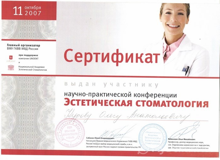 2007 г — клиническая интернатура по стоматологии общей практики на базе Военного госпиталя им. Бурденко г. Москва Специальность: стоматология общей практики