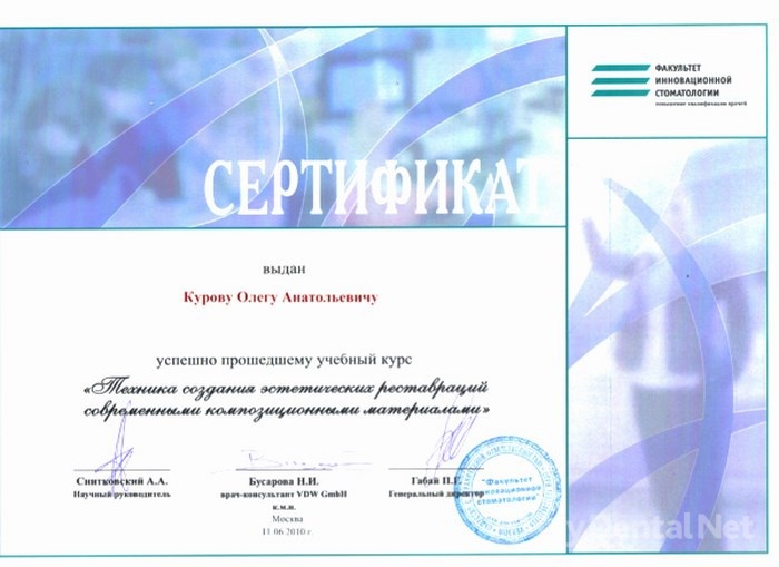 Июнь 2010г – «Техника создания эстетических реставраций современными композиционными материалами.»