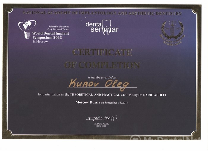Сентябрь 2013г – Международный имплантологический симпозиум: Теоретический и практический курс Dr. Dario Adolfi.