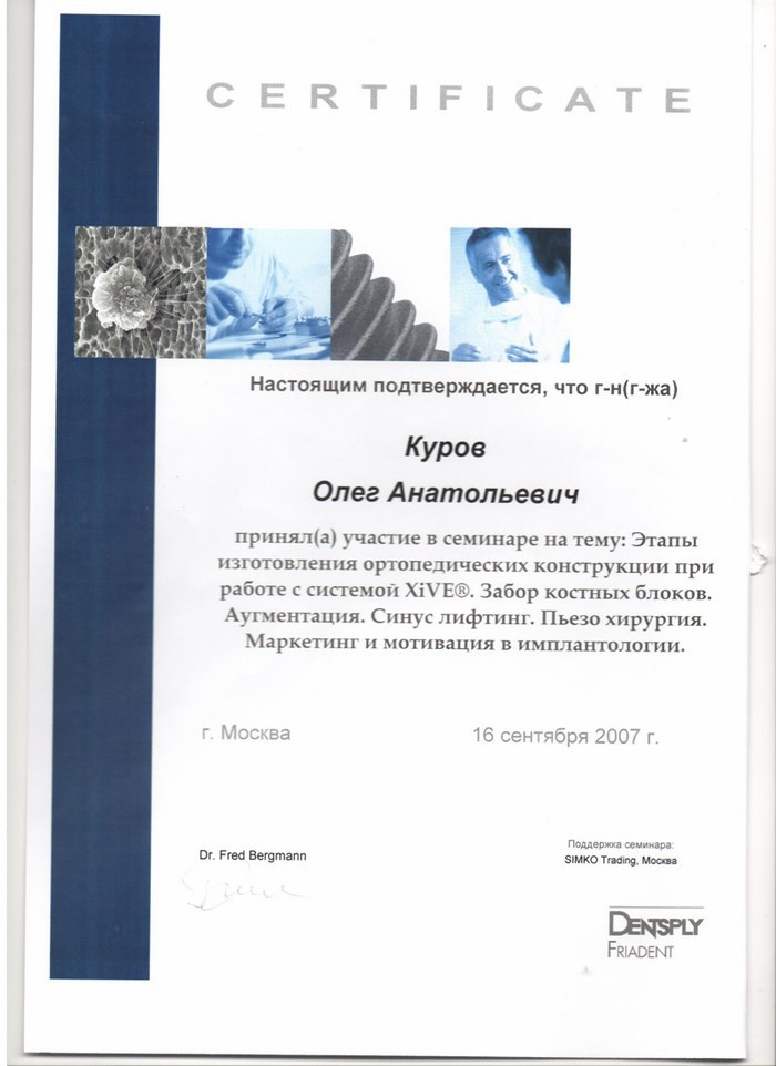 Сентябрь 2007г г. Москва – семинар на тему: Этапы изготовления ортопедических конструкций при работе с системой XiVe. Забор костных блоков. Аугментация. Синус лифтинг. Пьезо хирургия. Маркетинг и мотивация в имплантологии.