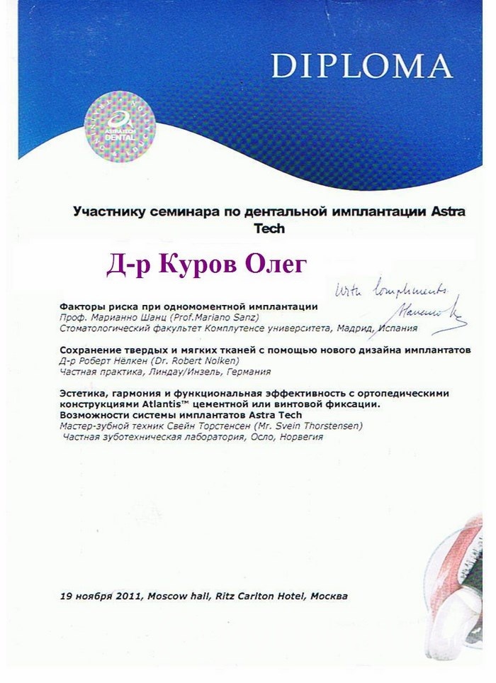 2011г- Повышение квалификации: «Хирургические техники немедленной имплантации и синус -лифтинга» (Швеция)