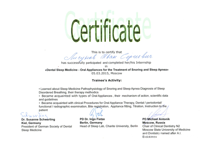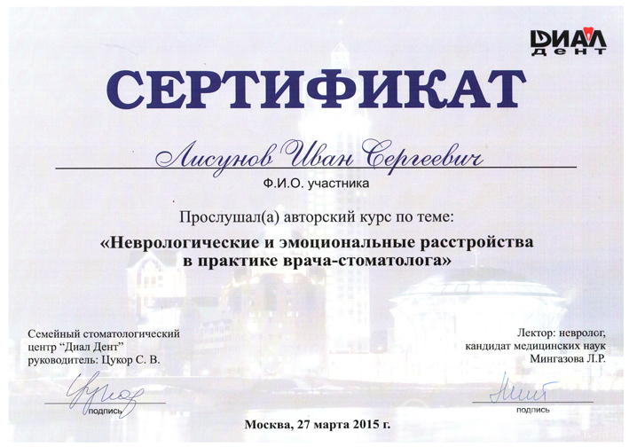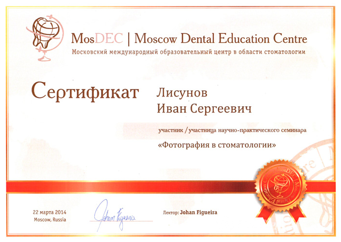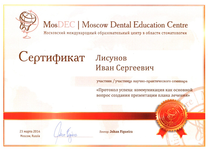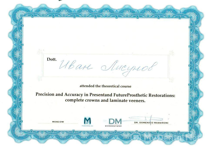 Иван Сергеевич постоянно отслеживает появление новых технологий и методик в области стоматологии, перенимает опыт известных стоматологов США, Израиля, Германии, посещая мастер-классы, лекции и курсы повышения квалификации. О разносторонних и углубленных знаниях врача говорят сертификаты и дипломы, полученные в рамках дополнительного образования. Пациенты И.С. Лисунова оставляют только положительные отзывы, подчеркивая его высокую компетентность и внимание к деталям. Стоматолог добивается высоких результатов в лечении благодаря точной работе на каждом этапе.