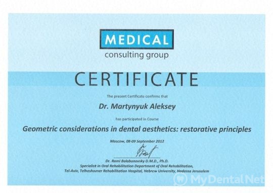 Проходил неоднократное сертифицированное обучение и повышение квалификации по ортопедической стоматологии, как в России, так и в Европе.