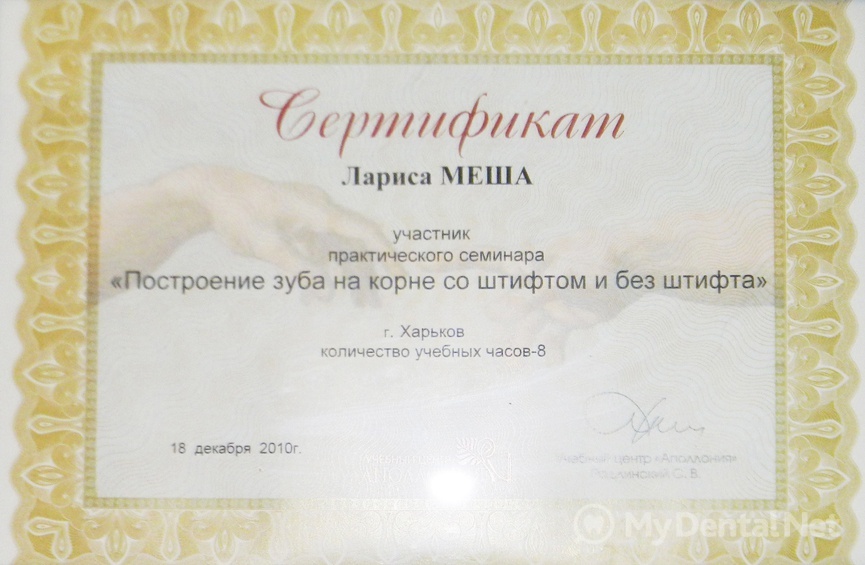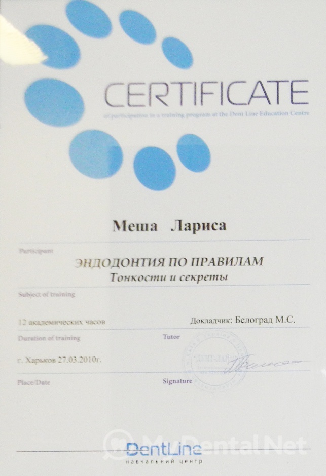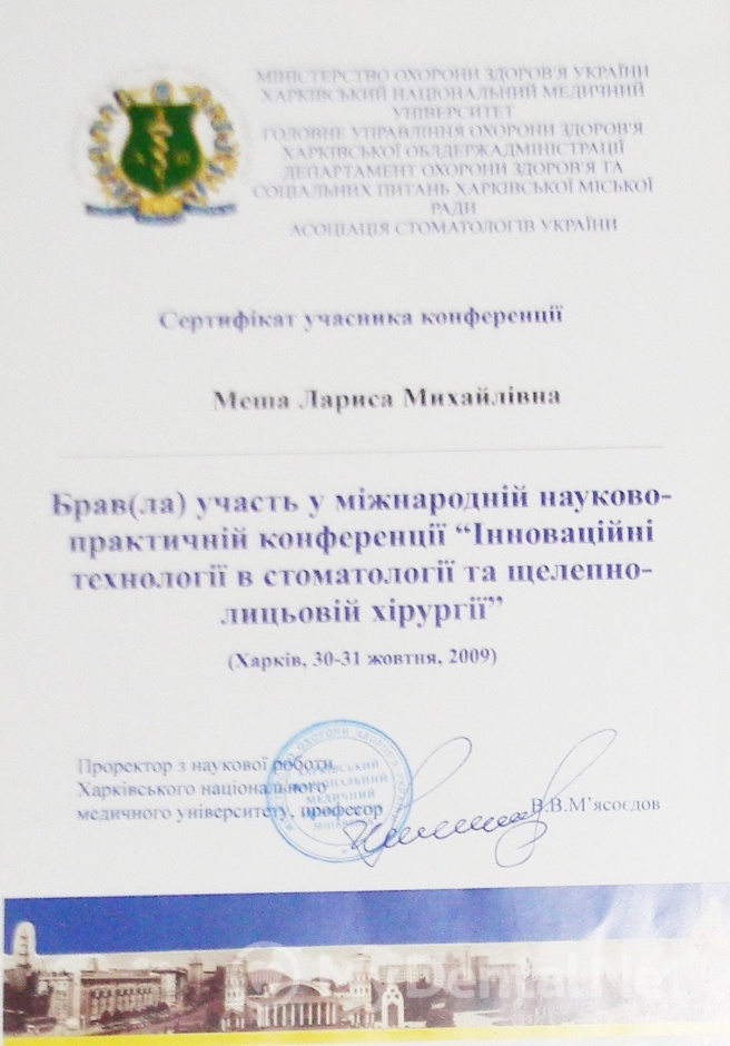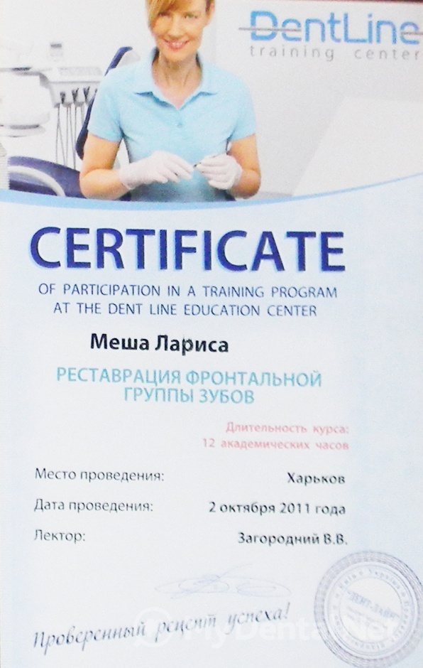 Являюсь членом Ассоциации Стоматологов Украины. Окончила Харьковский Национальный Медицинский Университет по специальности "Стоматология". Кроме того один раз в пять лет повышаю категорию в Харьковской академии последипломного образования.
