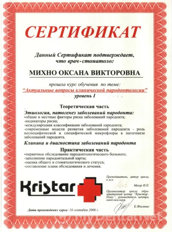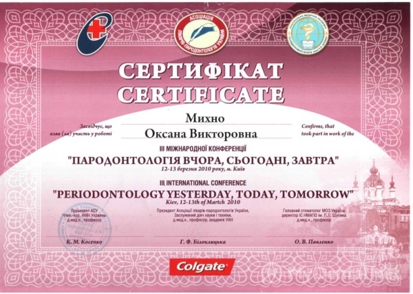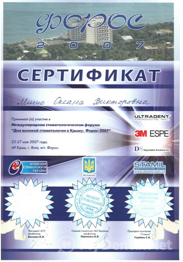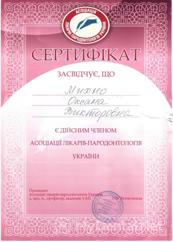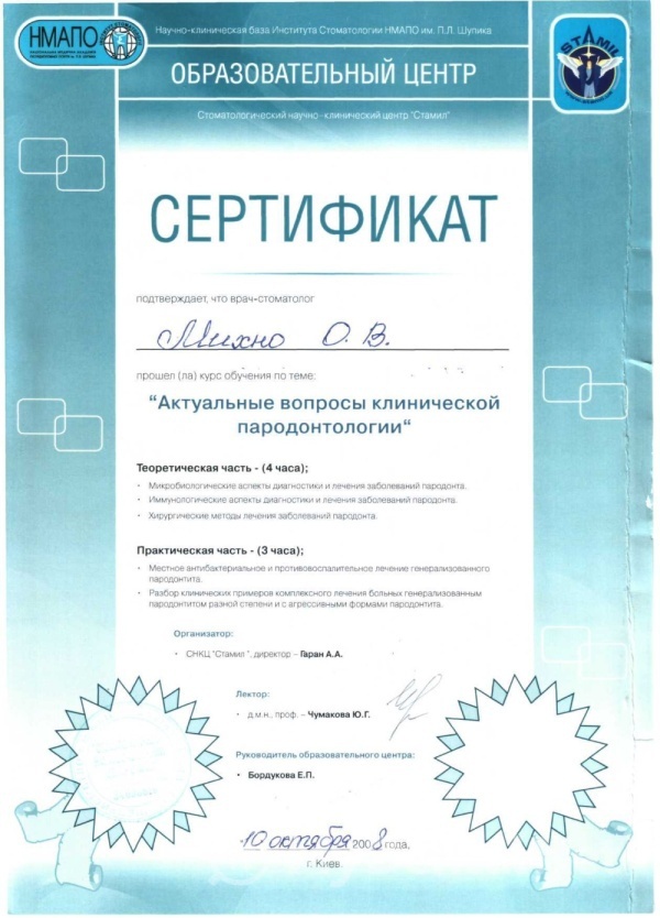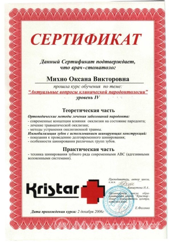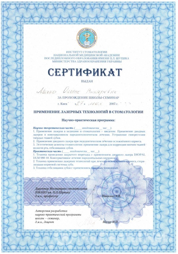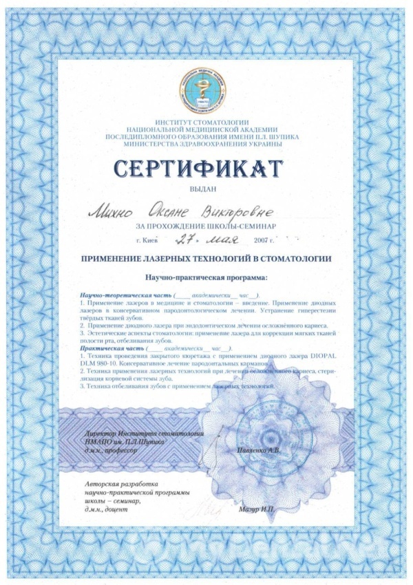 2011 год – подтвердила вторую квалификационную категорию по специальности «Терапевтическая стоматология».