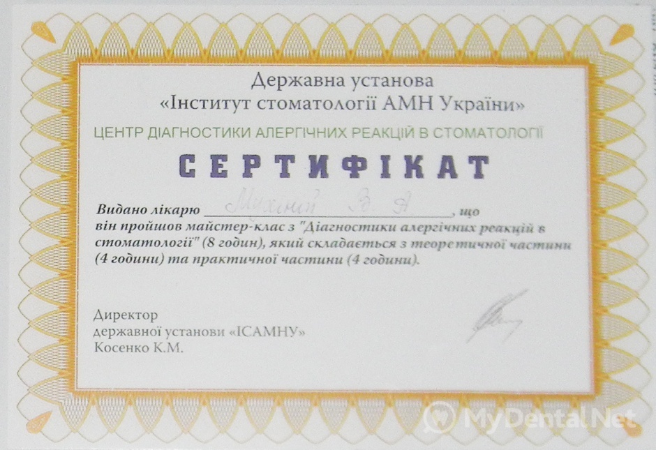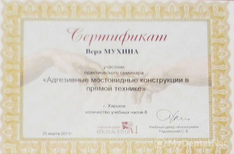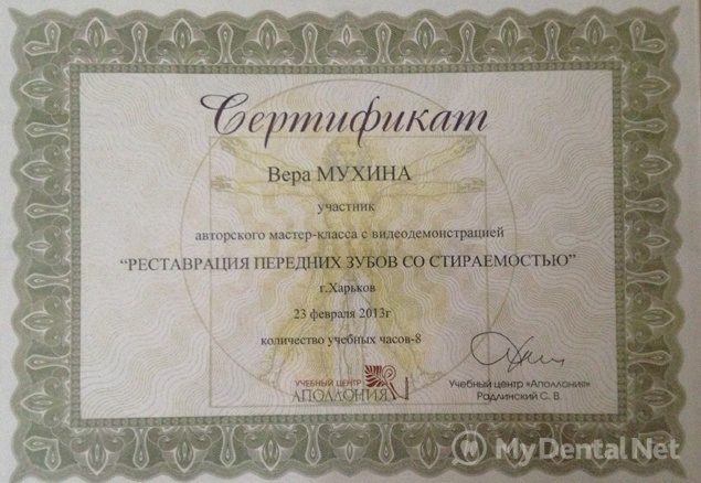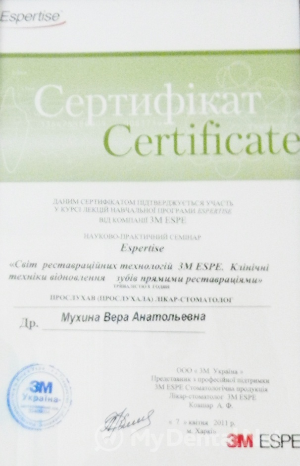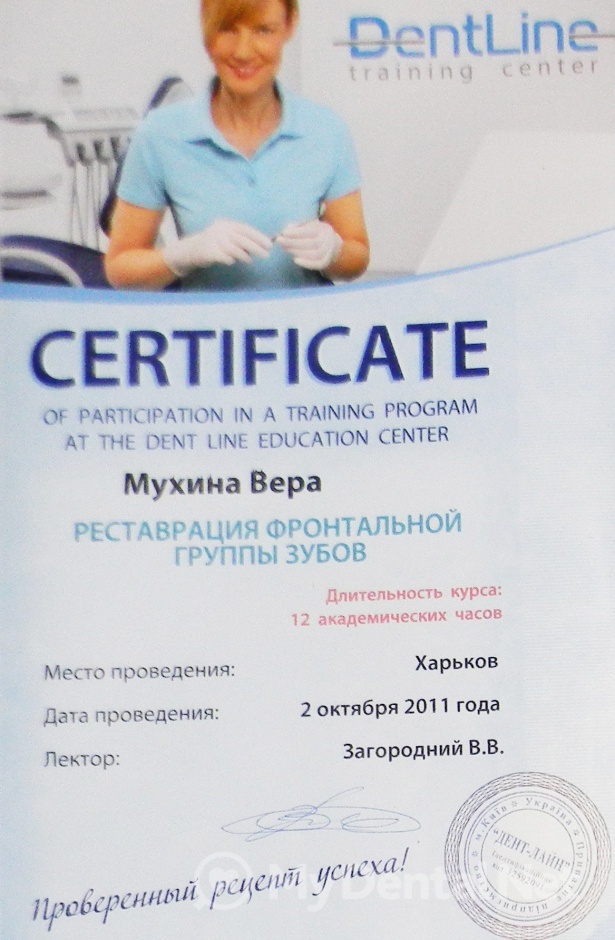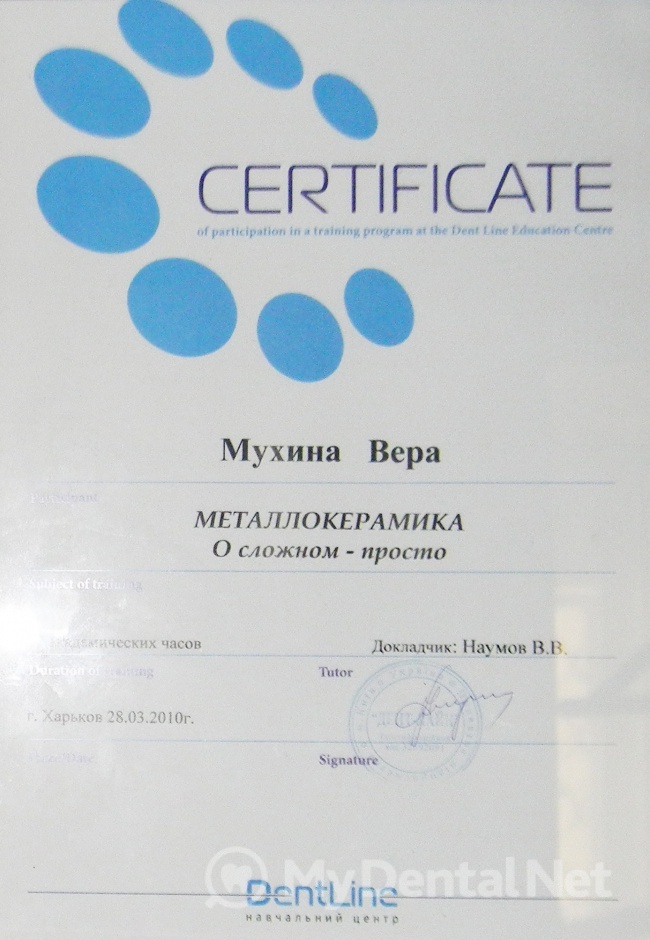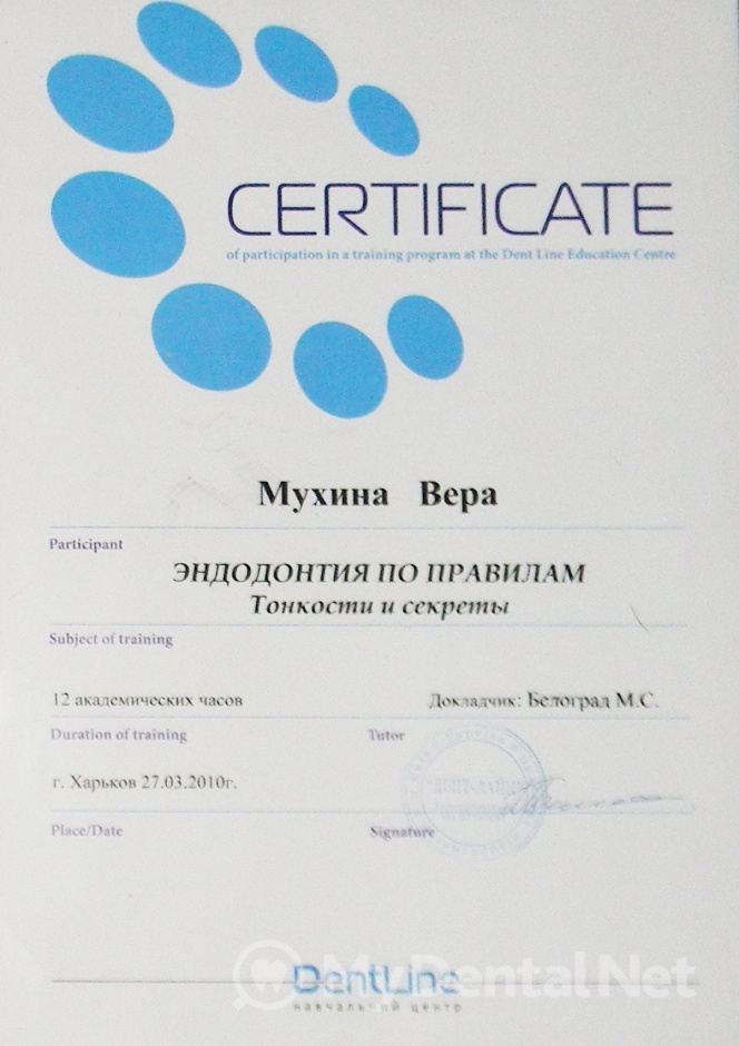 Являюсь членом Ассоциации Стоматологов Украины. Окончила Харьковский Национальный Медицинский Университет по специальности "Стоматология". Кроме того один раз в пять лет повышаю категорию в Харьковской академии последипломного образования.