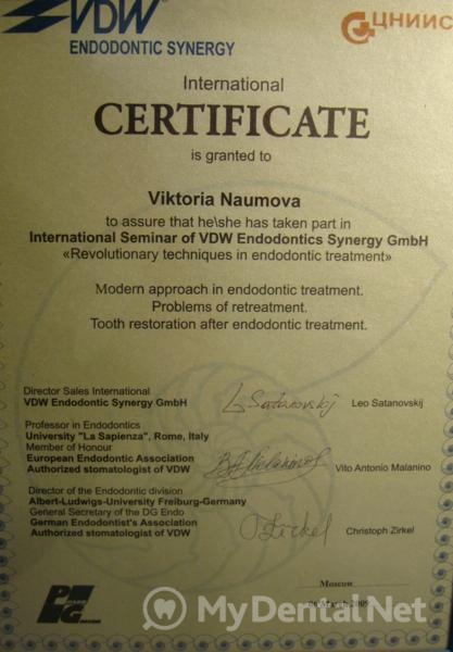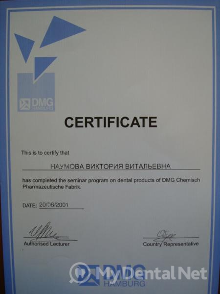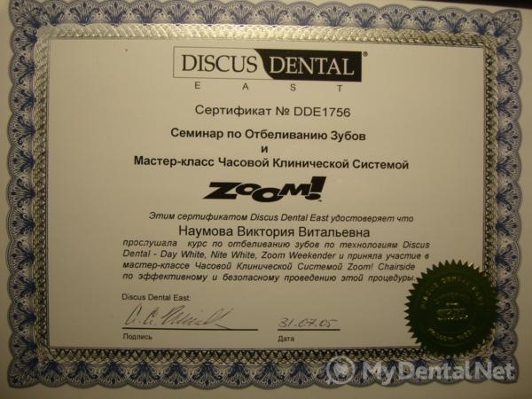 июнь 2005 - прошла курс по отбеливанию зубов (Discus Dental - Day White, Nite White, Zoom Weekender) и приняла участие в мастер-классе Часовой Клинической Системой Zoom! Chairside по эффективному и безопасному проведению этой процедуры.