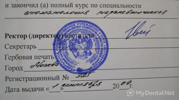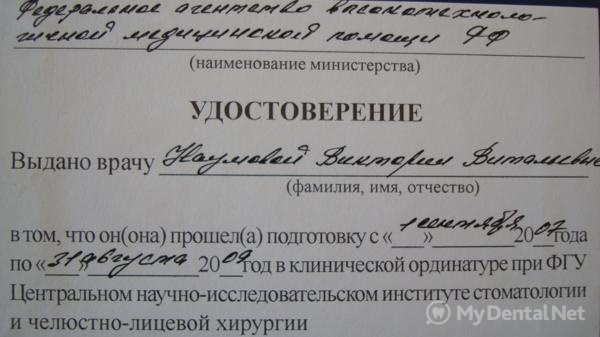 Клиническая ординатура на базе ФГУ ЦНИИС и ЧЛХ по специальности стоматология терапевтическая 2007-2009 г.