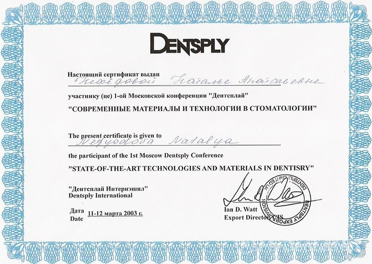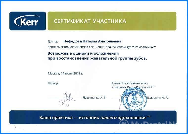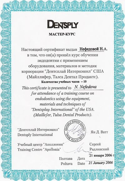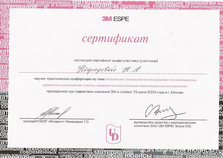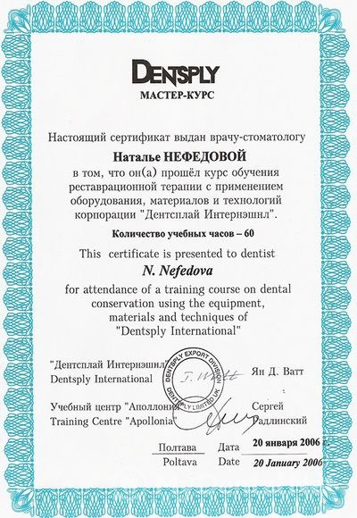 Квалификация: Сертификат ММСИ (терапевтическая стоматология), Сертификат Dentsplay International USA (мастер-курс эндодонтии), Сертификат Dentsplay International USA (современные материалы и технологии в стоматологии), Сертификат Dentsplay International USA (мастер-курс реставрационной терапии), Сертификат 3M ESPE (новейшие технологии использования стеклоиономерных цементов и композиционных материалов), Сертификат компании Kerr “Возможные ошибки и осложнения при восстановлении жевательной группы зубов”.
