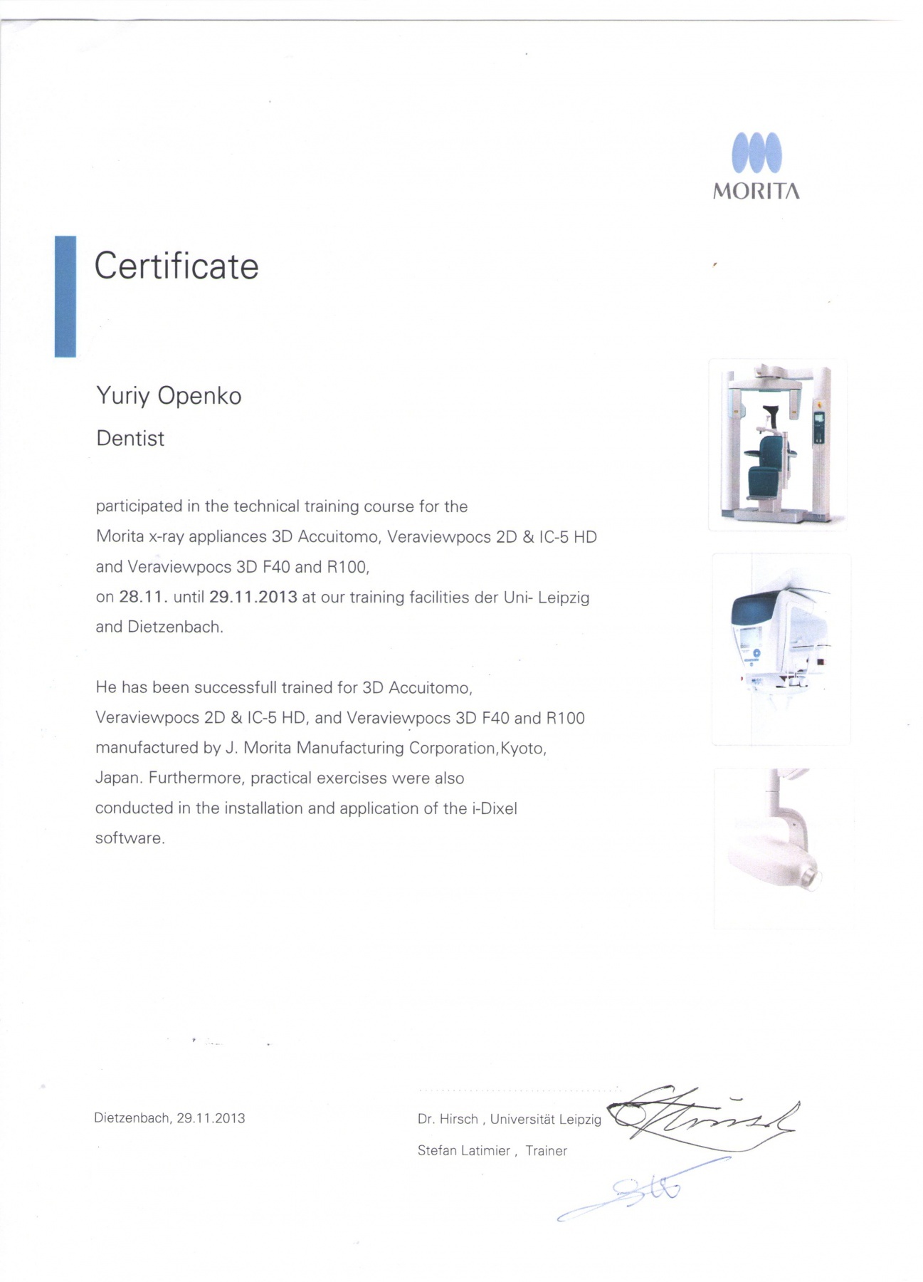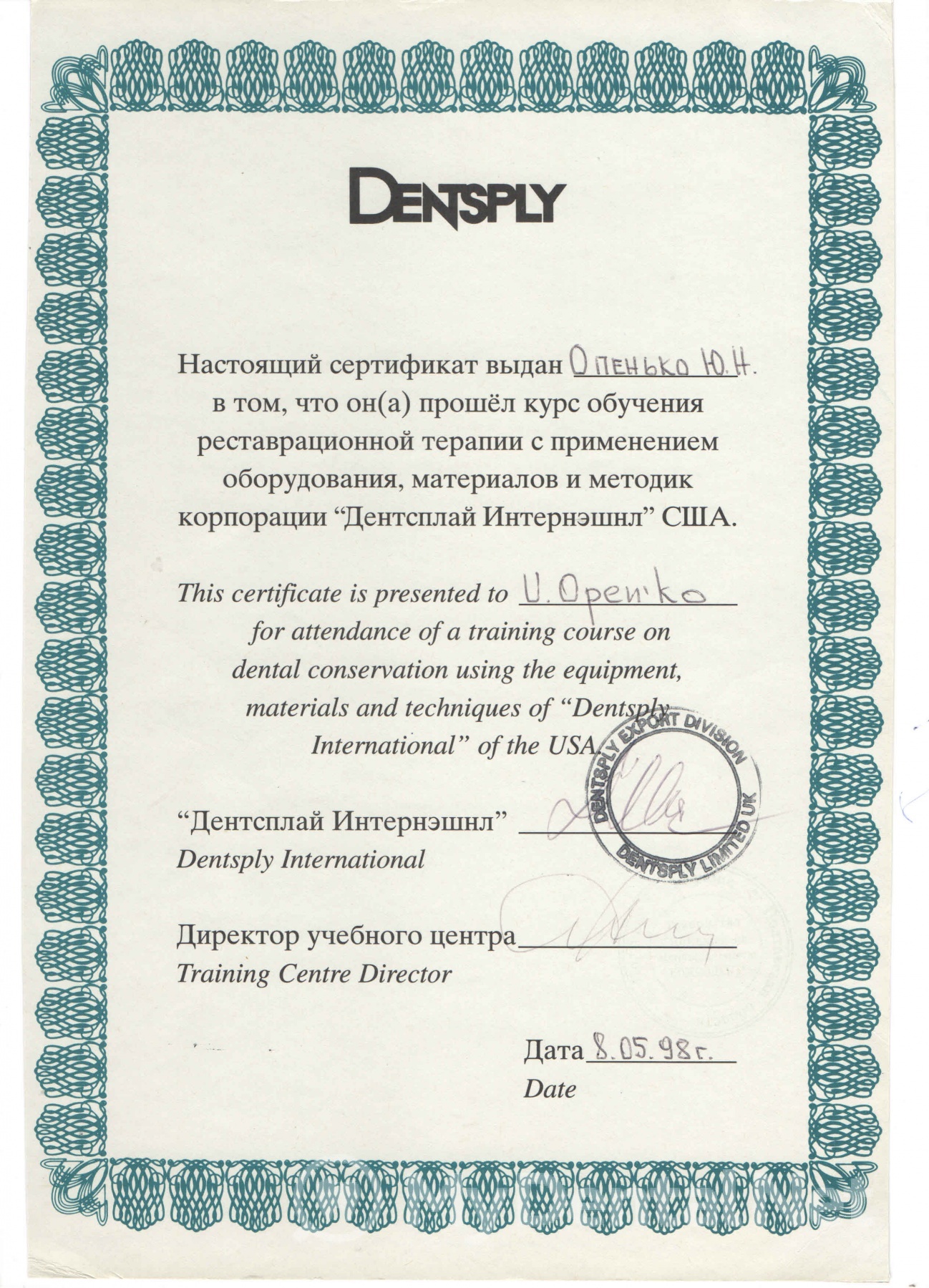 1998 год — прошел курс обучения реставрационной терапии с применением оборудования, материалов и методик корпорации «Дентсплай Интернэшнл», США.