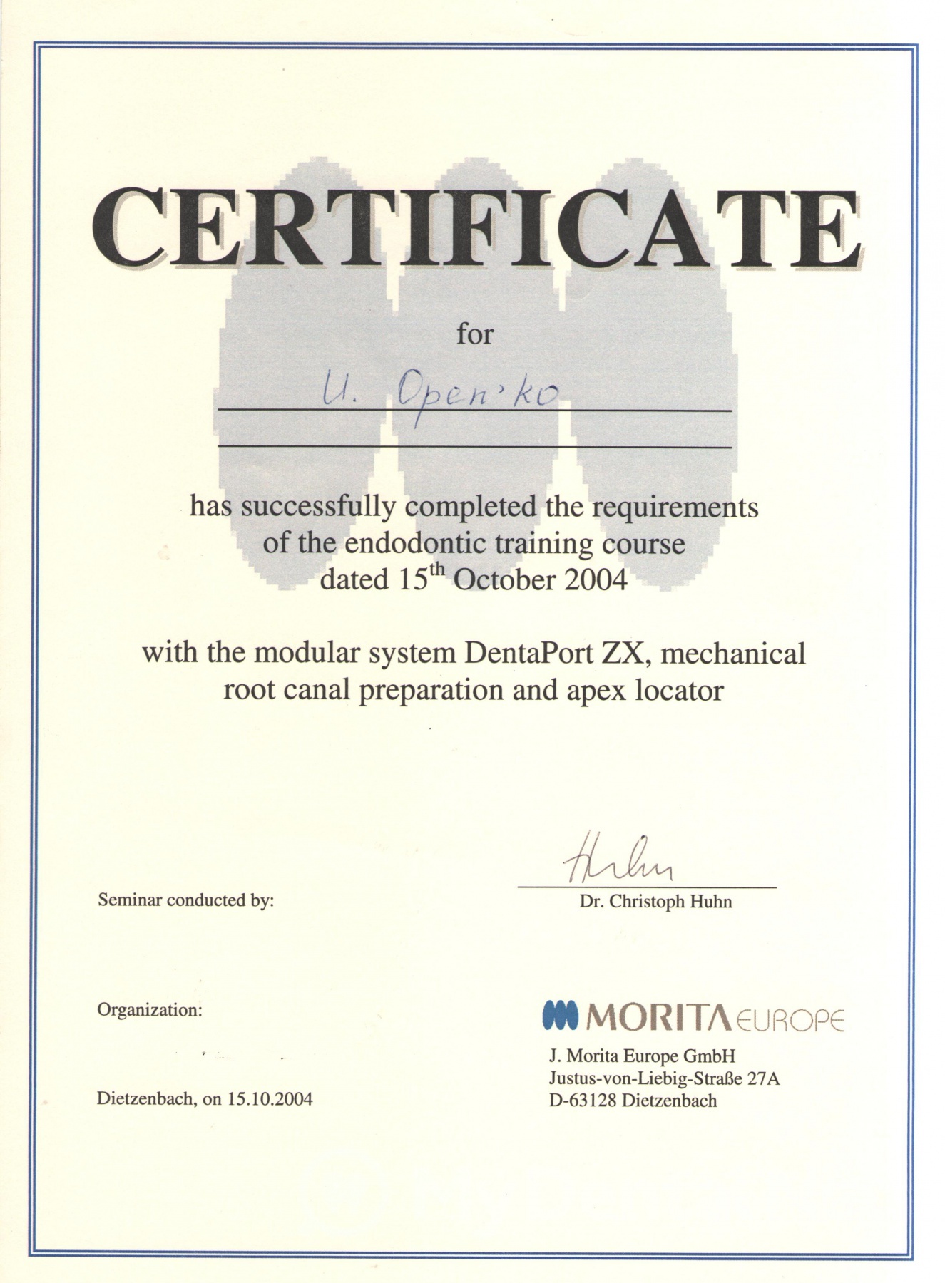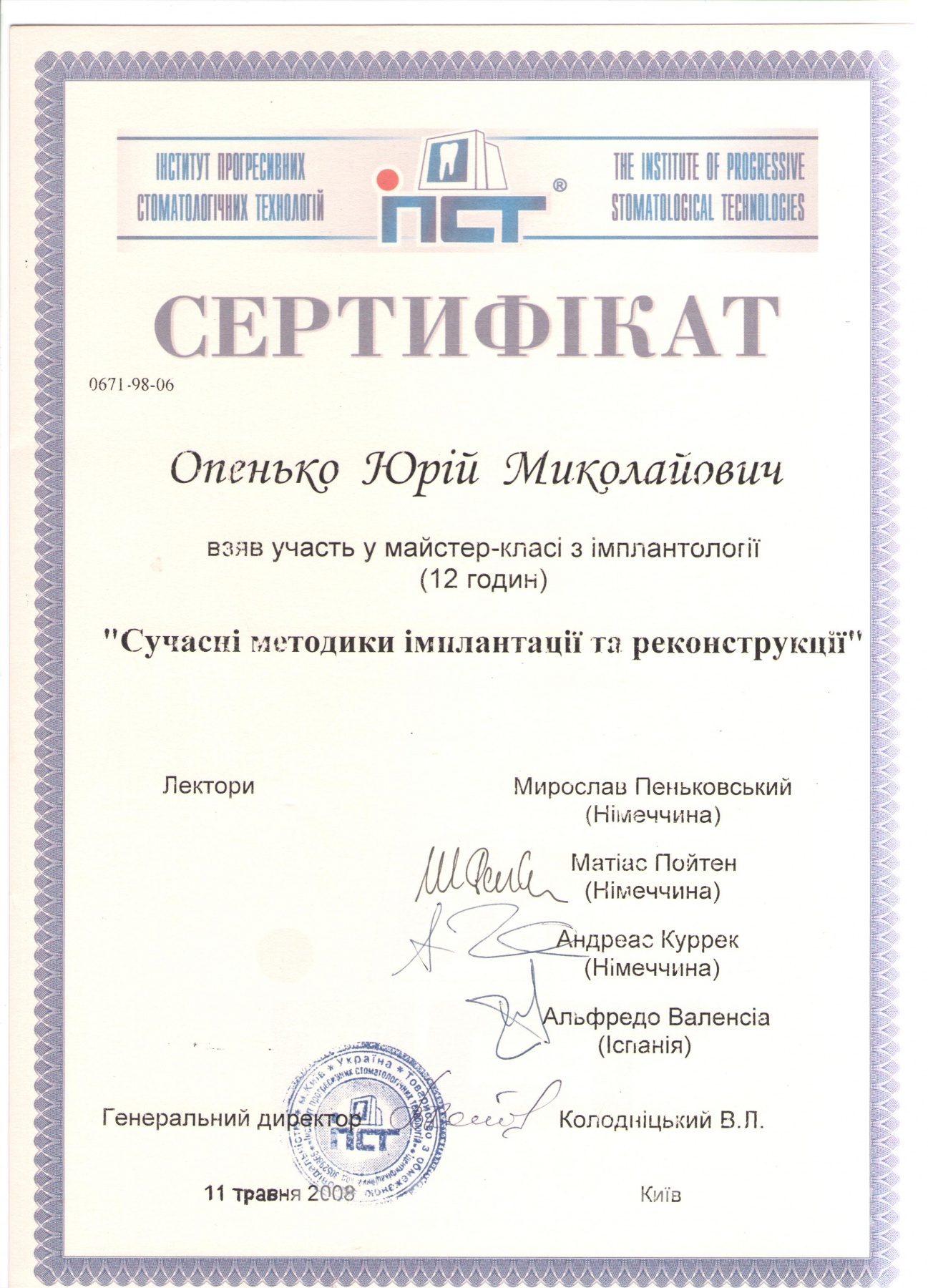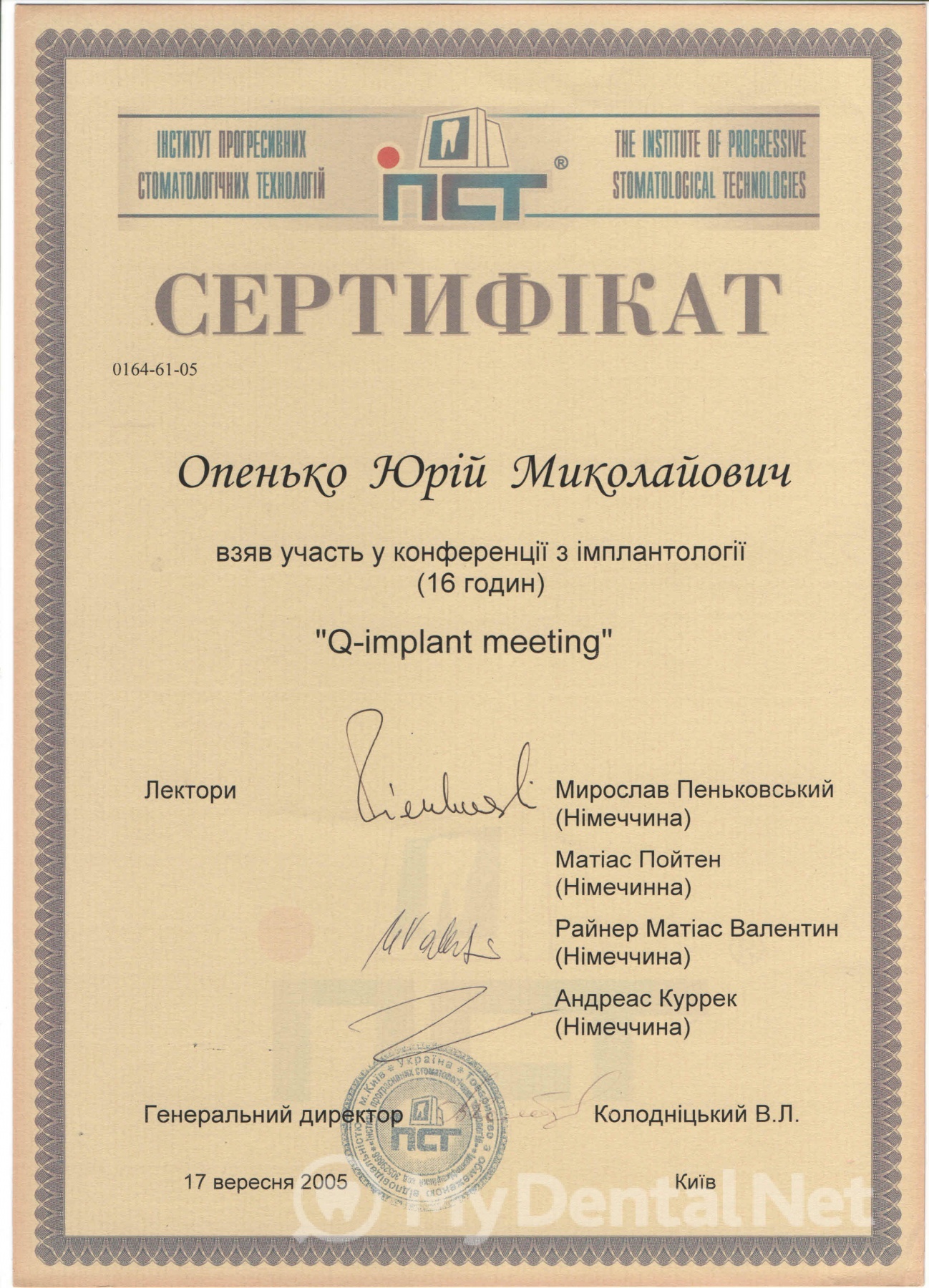 2004 год — прослушал теоретический и выполнил практический курс «Одноэтапная имплантация с использованием системы Q-имплантатов. Протезирование на одноэтапных Q-имплантатах» (компания Trinon, Германия).