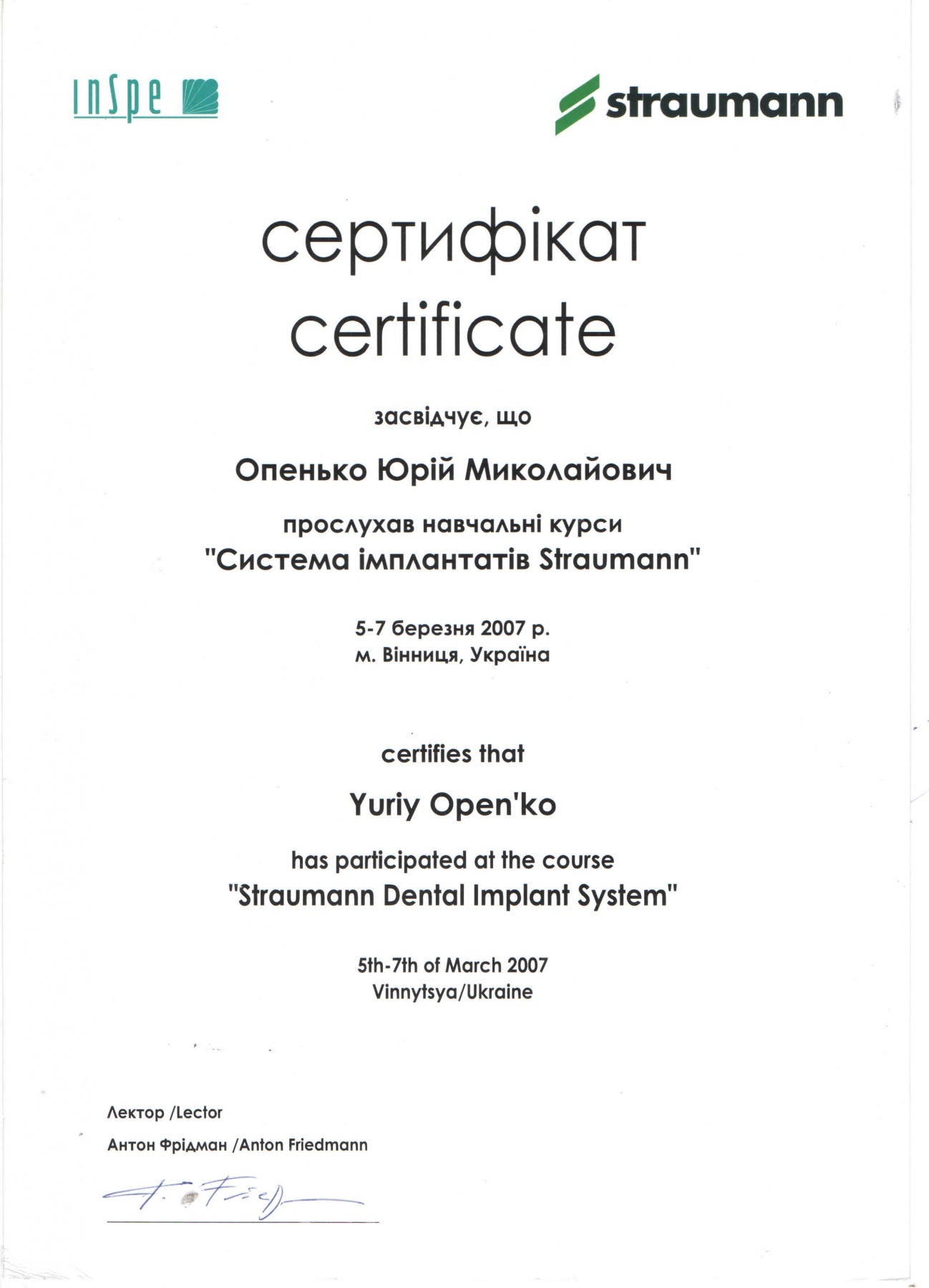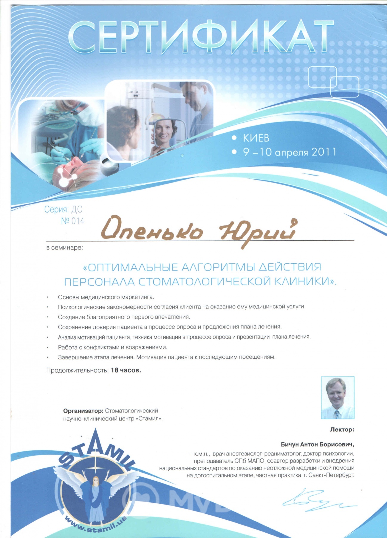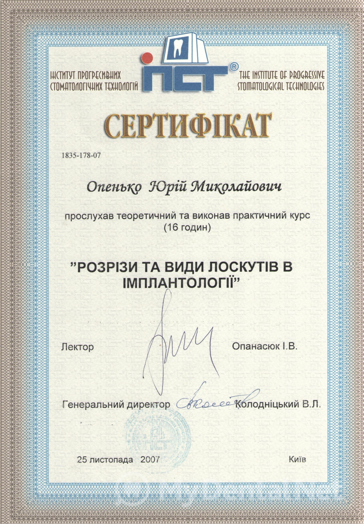2007 год — прослушал теоретический и выполнил практический курс «Разрезы и виды лоскутов в имплантологии».