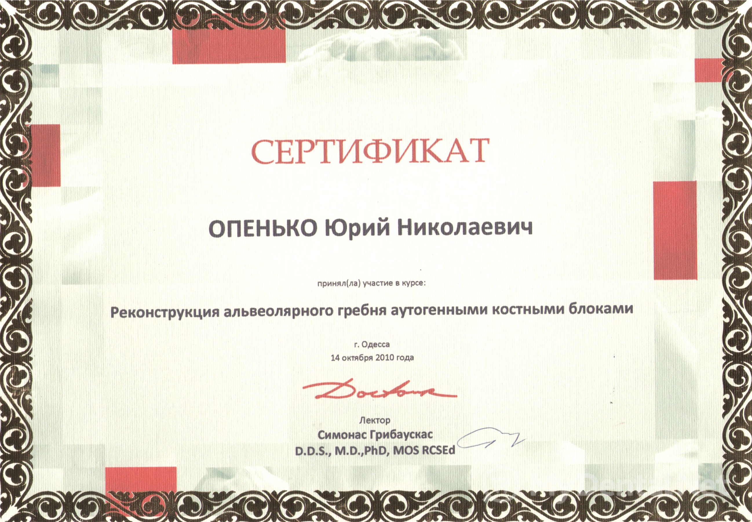 2010 год — принял участие в курсе «Реконструкция альвеолярного гребня аутогенными костными блоками».