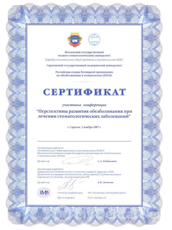 2007 г. — участник Конференции Перспективы развития обезболивания при лечении стоматологических заболеваний профессор Рабинович С. А., профессор Лепилин А. В.