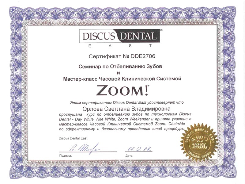 2007 г. — Семинар «Отбеливание Зубов и Мастер-класс Часовой Клинической Системой ZOOM», Москва.