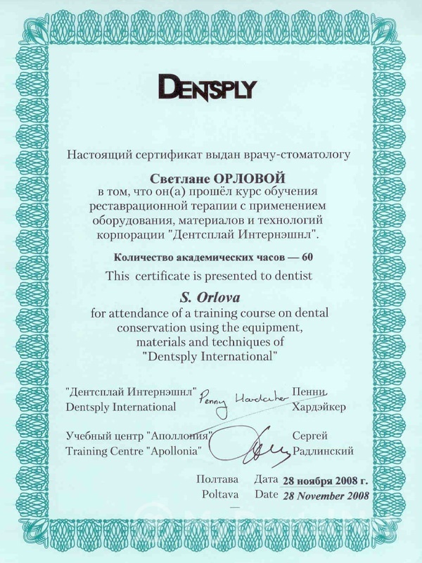 2008 г. — Курс обучения реставрационной терапии с применением оборудования, материалов и технологий корпорации «Дентсплай Интернэшнл», доктор Радлинский Сергей, Полтава.