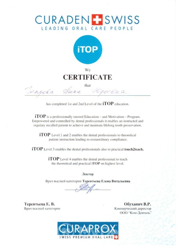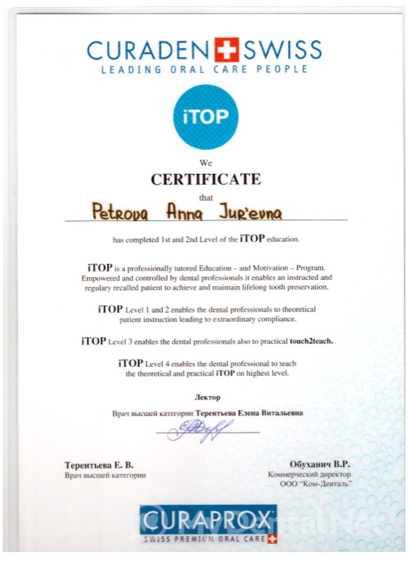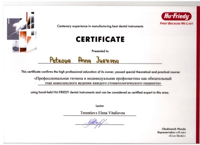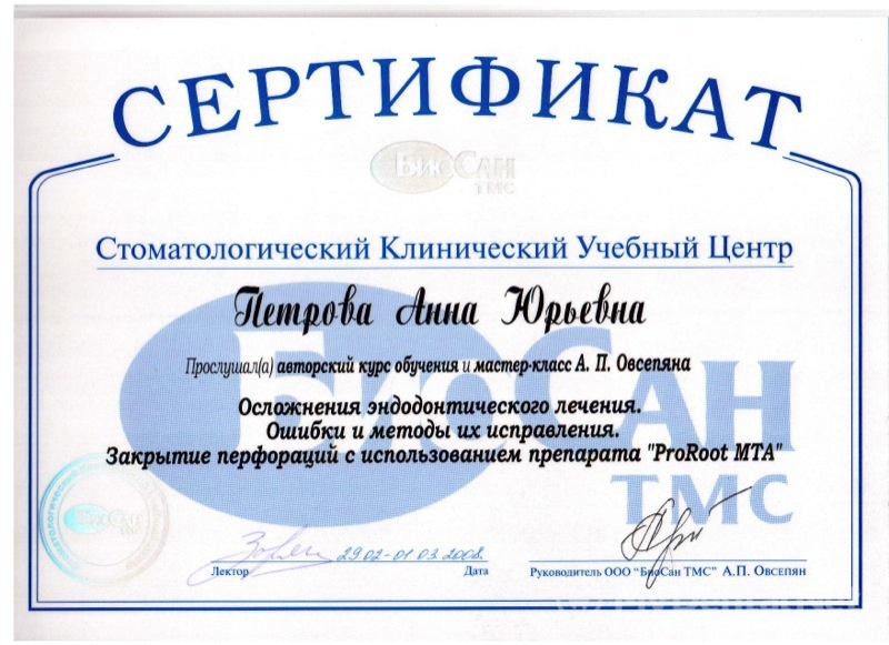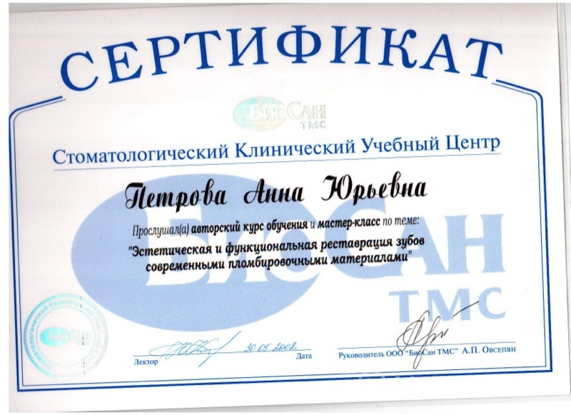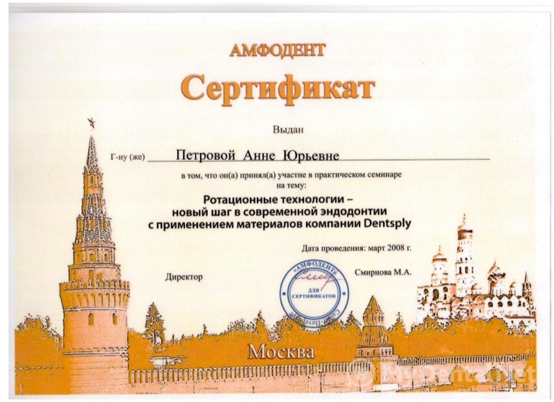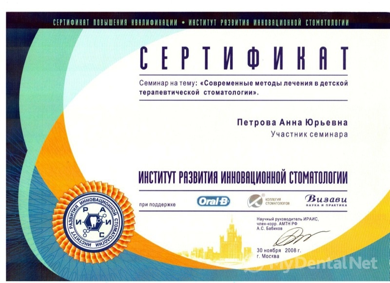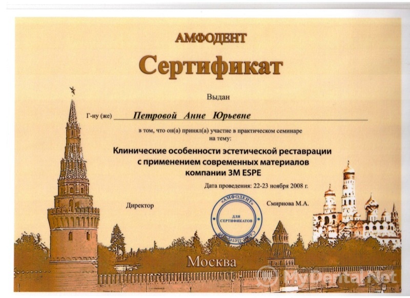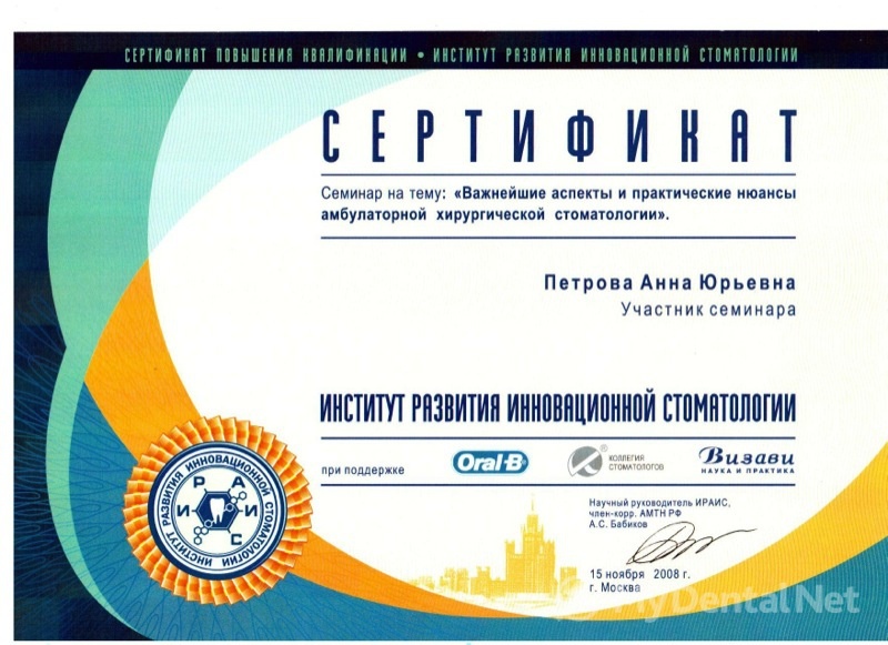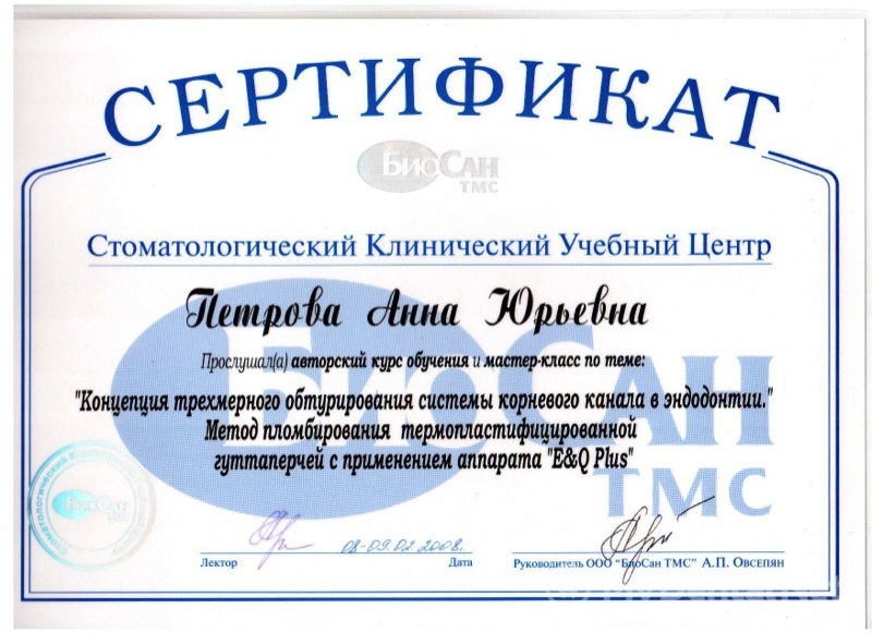 2002г. - закончила интернатуру на кафедре госпитальной хирургической стоматологии.