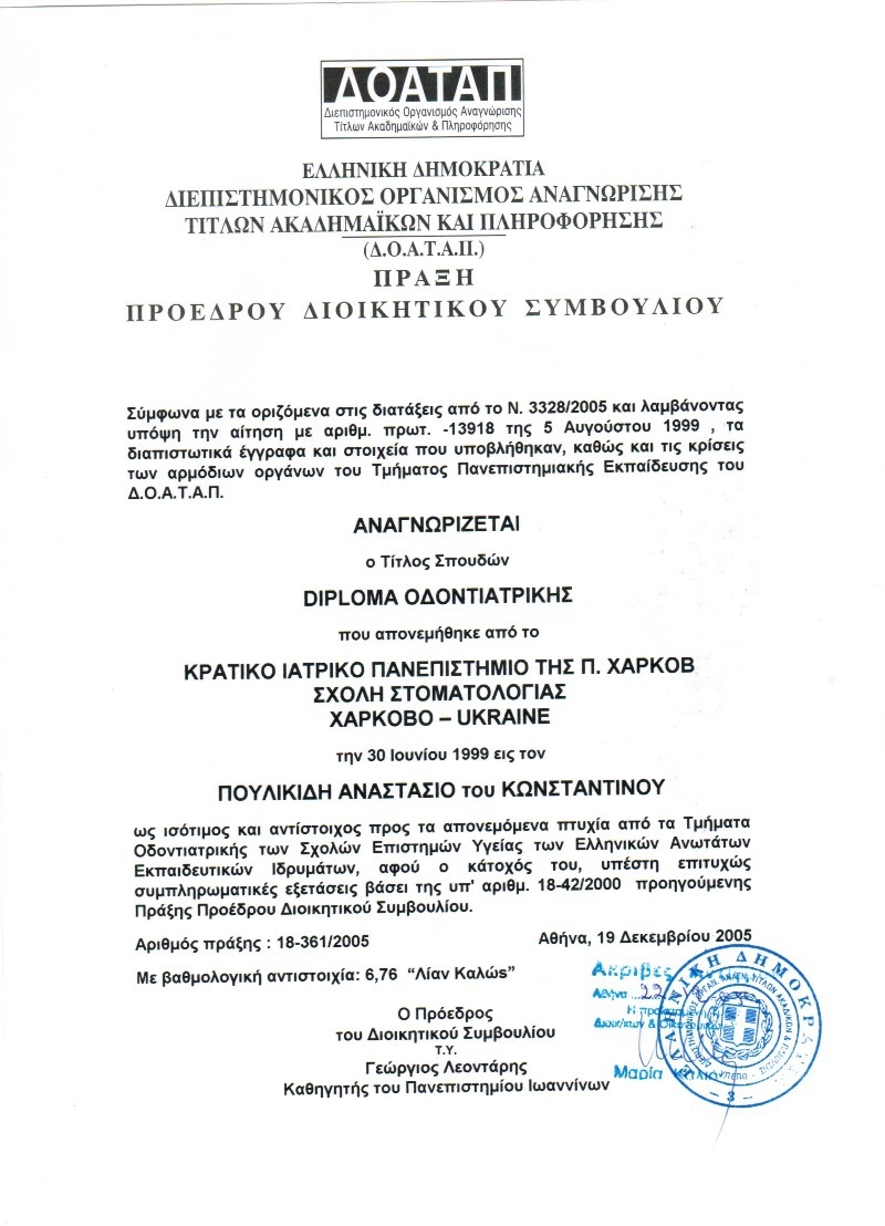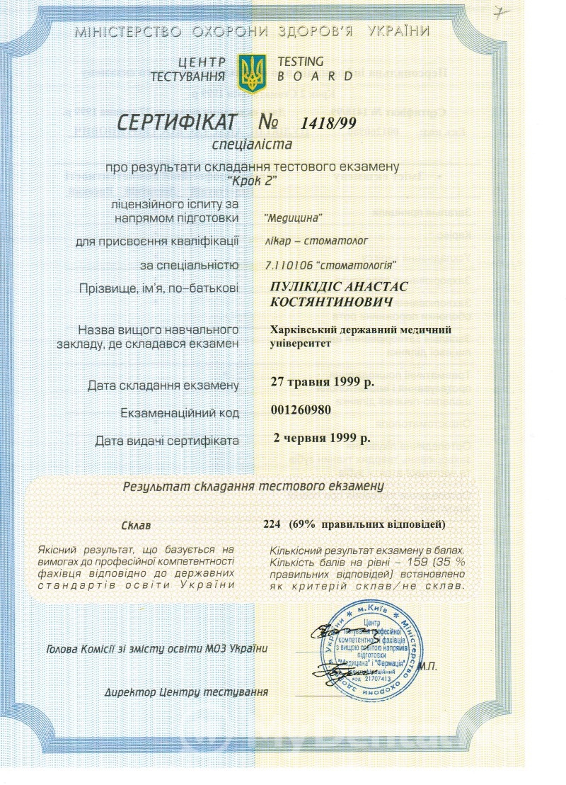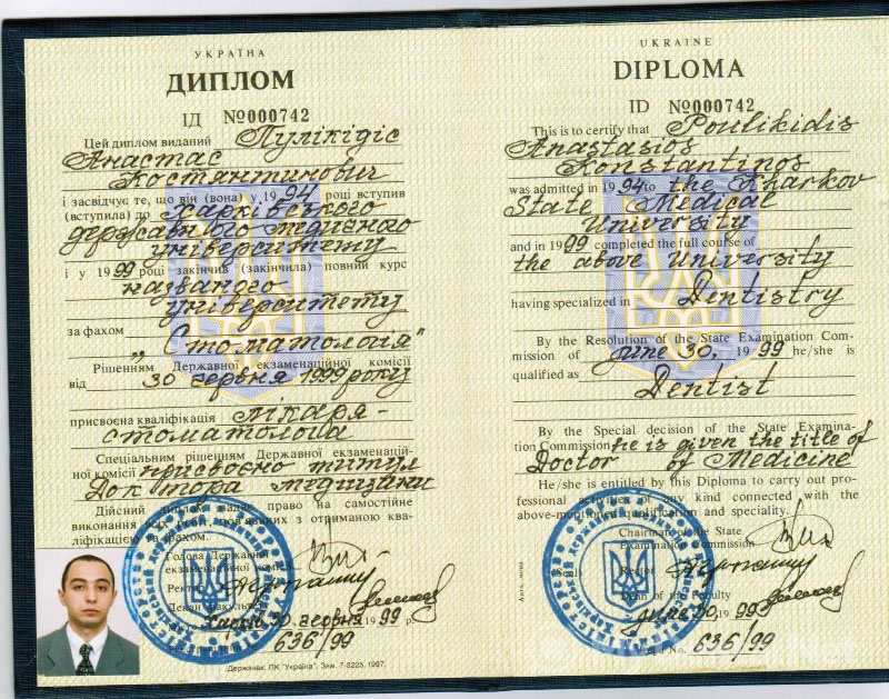 2000-2002 Диплом ХГМУ подтвержден Европейским союзом стоматологов в Греции. Афинский Стоматологический институт