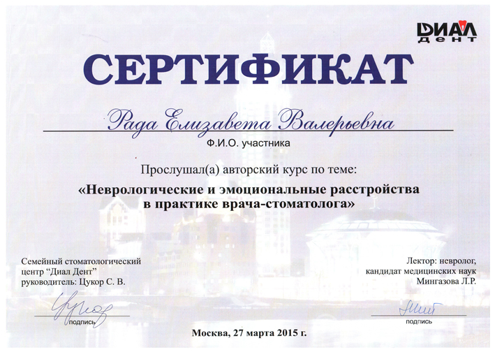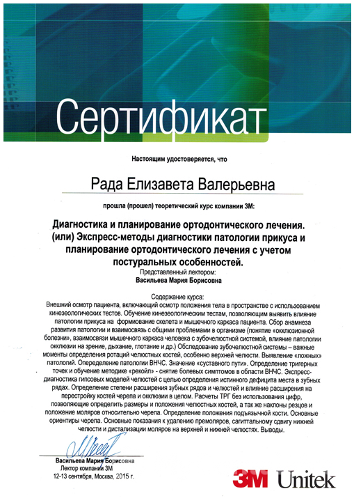 Стремится помочь людям обрести красивую улыбку и уверенность в себе. Стоматология вообще и ортодонтия в частности на сегодняшний день очень динамично развивающиеся отрасли медицины, поэтому Елизавета Валерьевна регулярно посещает обучающие семинары, о чем свидетельствуют многочисленные дипломы, свидетельства и сертификаты, читает тематическую литературу, обменивается опытом с коллегами. Очень любит работать с детьми.