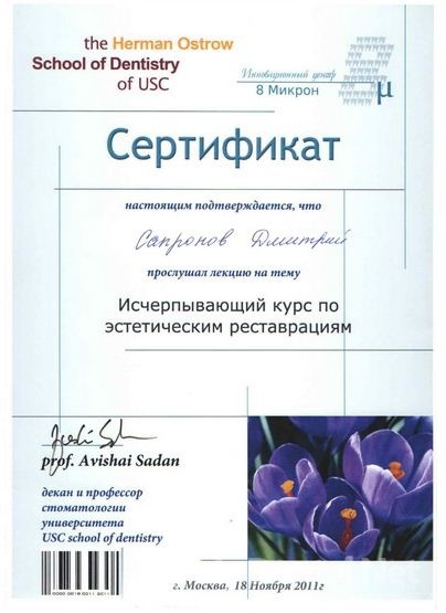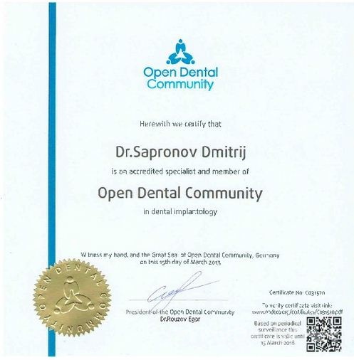 Прошел обучение в России по курсу "Протезирование зубов на базальных и компрессионных имплантах" на базе Open Dental Community.