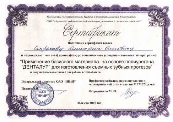 Повышение квалификации по ортопедической стоматологии на базе ГОУ ДПО «Российская Медицинская Академия последипломного образования».