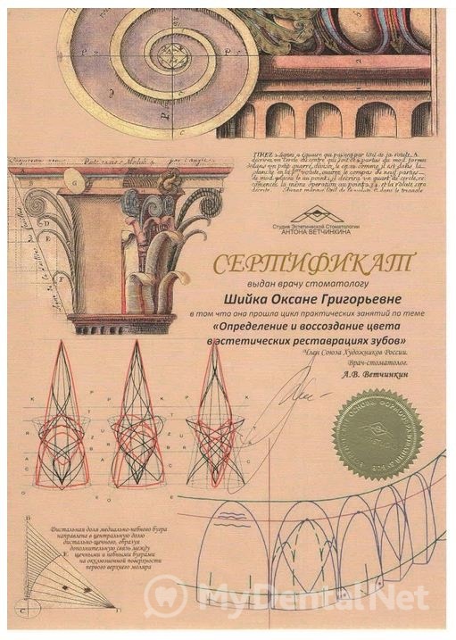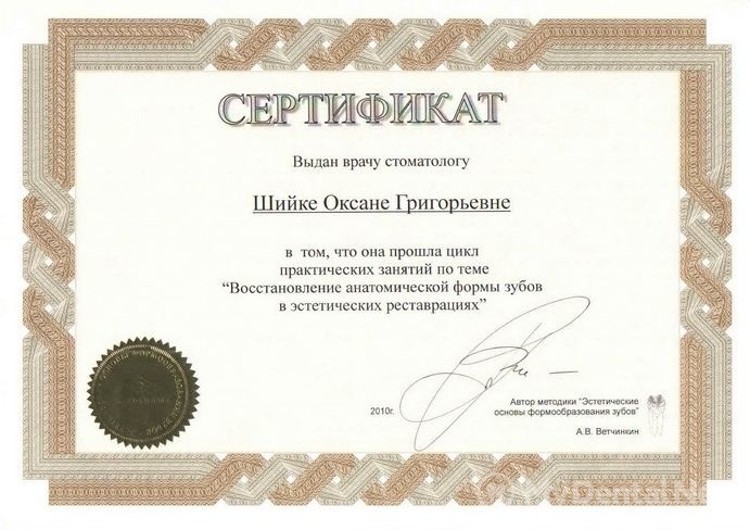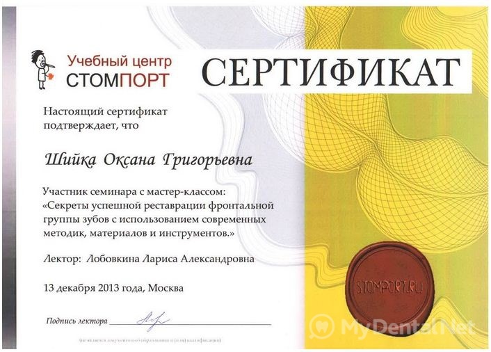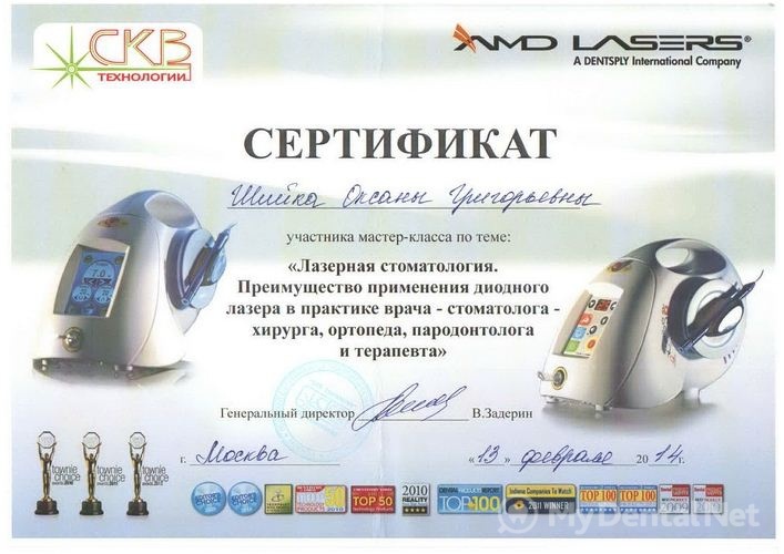 Проходила сертификацию на базе Уральской Государственной Медицинской Академии по специализации «терапевтическая стоматология».