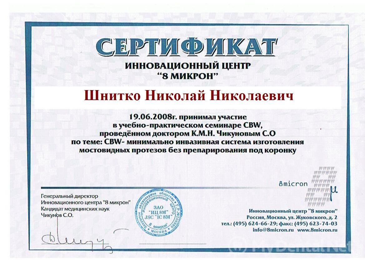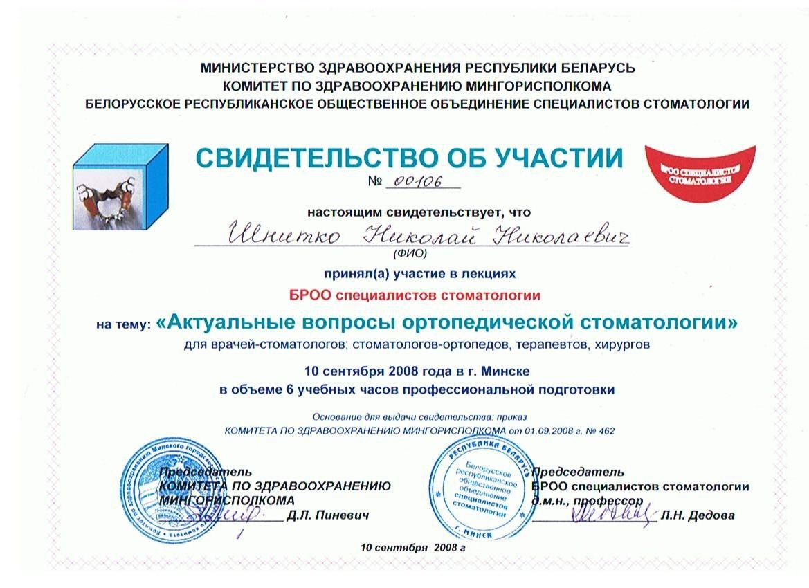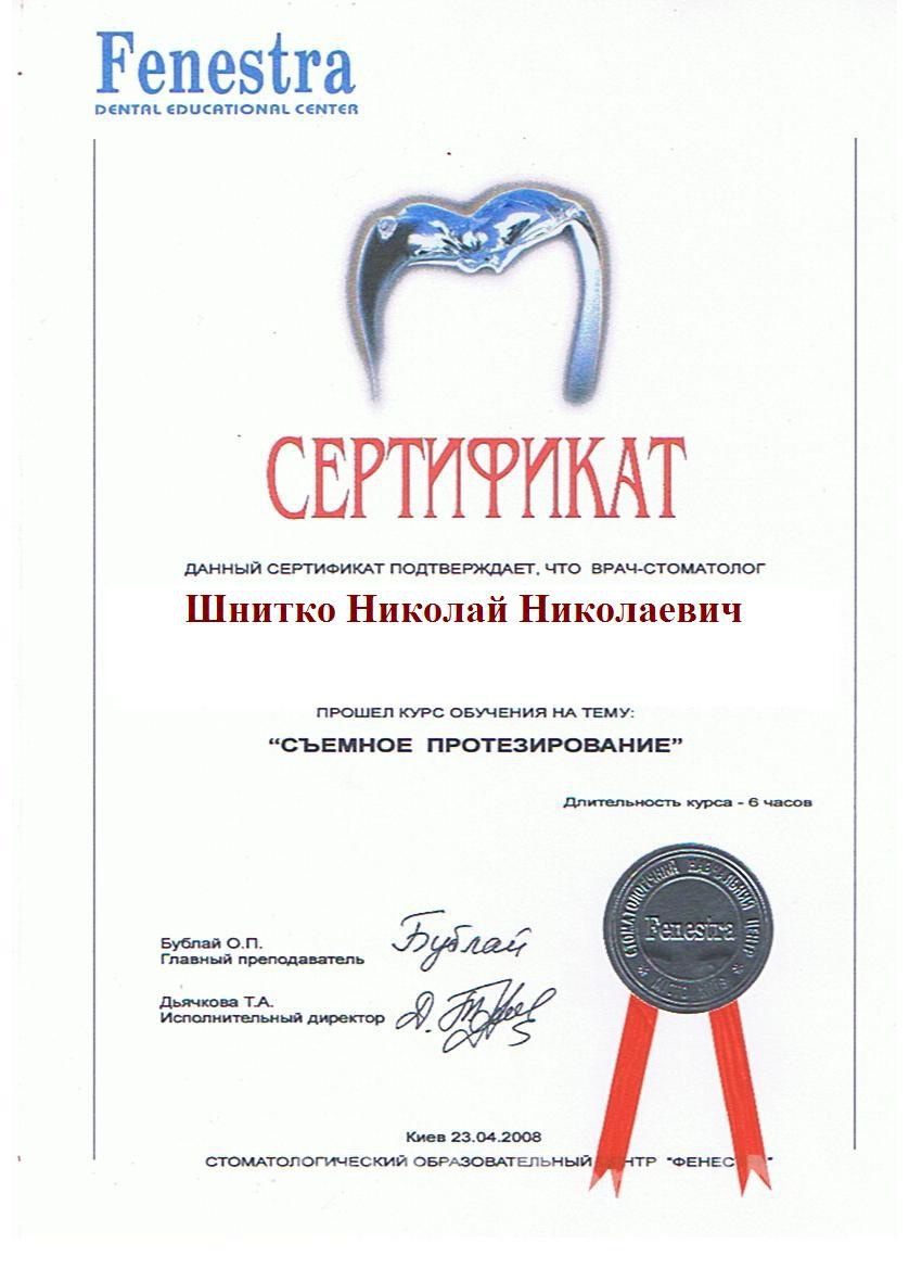2008г – Курсы в Стоматологическом Образовательном центре «Fenestra» «Микропротезирование»