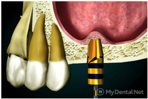 Ваш хирург будет делать разрез ткани десен с помощью специального инструмента, в области задних зубов. Приподнимается ткань, открывается небольшое, овальное окно в самой кости. Следующим этапом есть отслоение мембраны.