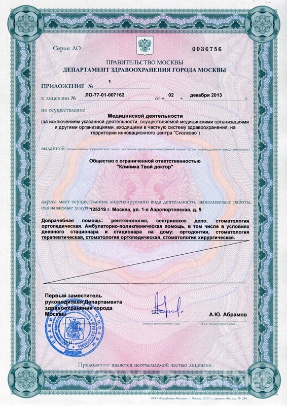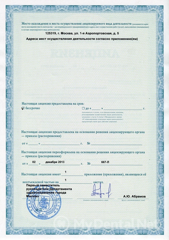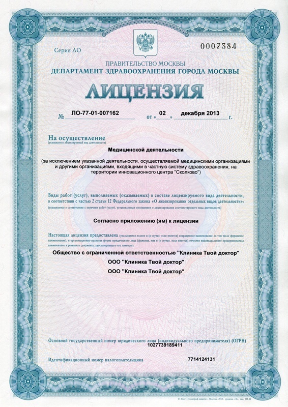 Бессрочная лицензия № ЛО-77-01-007162 от 2 декабря 2013 г. На осуществление «Медицинской деятельности», выдана Департаментом здравоохранения города Москвы.