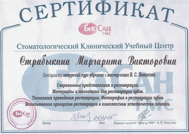 Квалификация: Сертификат МГМСУ (стоматология терапевтическая, ортопедическая, хирургическая, детская), Сертификат Стоматологического учебного Центра БиоСан ТМС (реставрация зубов и комплексное эстетическое лечение).