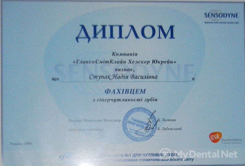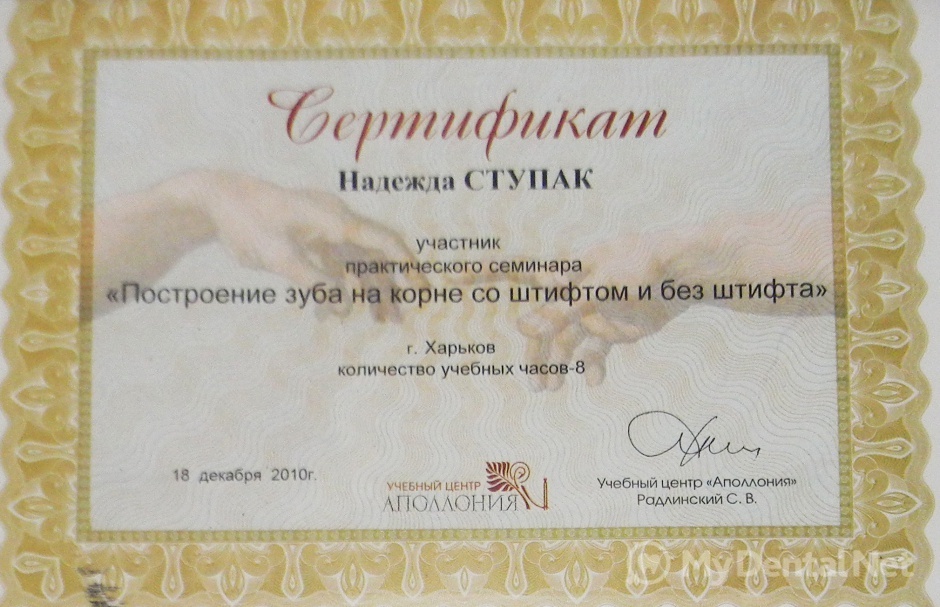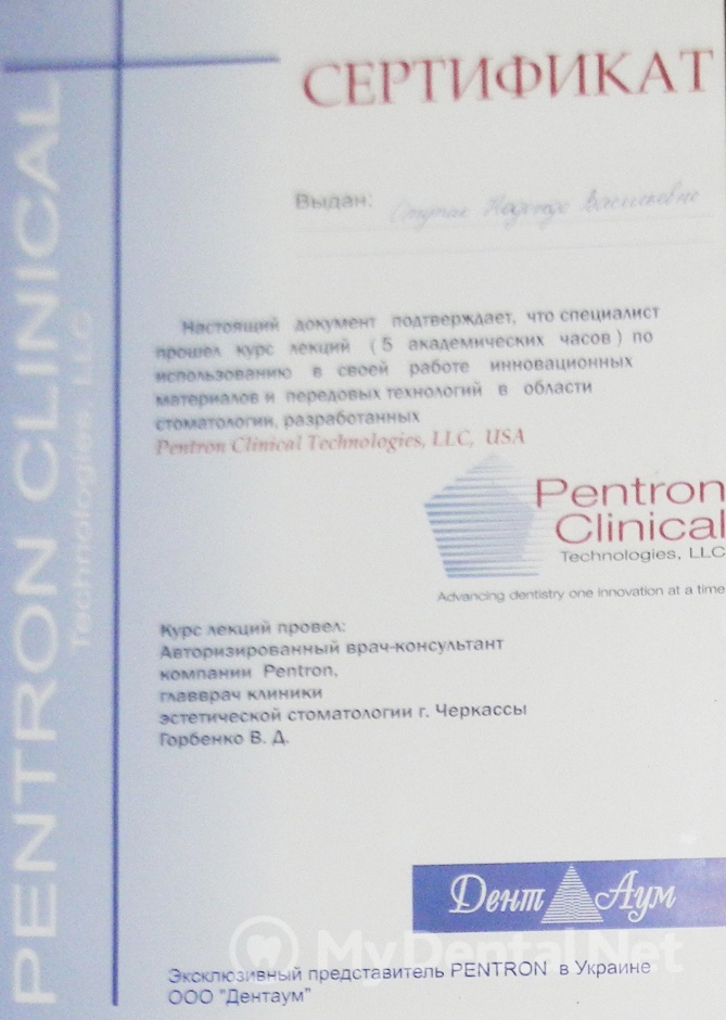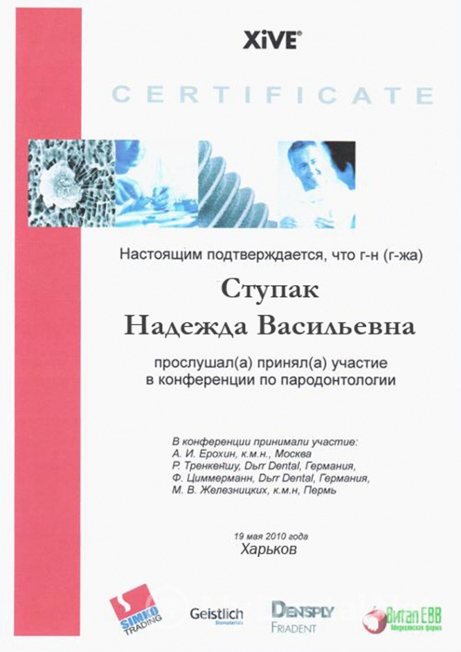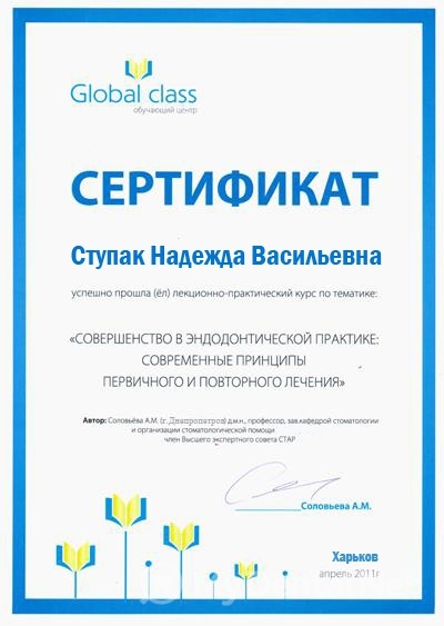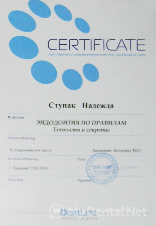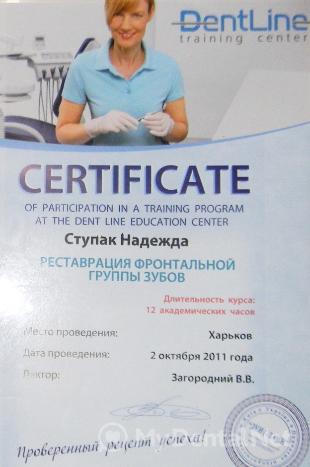 Являюсь членом Ассоциации Стоматологов Украины. Окончила Харьковский Национальный Медицинский Университет по специальности "Стоматология". Кроме того один раз в пять лет повышаю категорию в Харьковской академии последипломного образования.