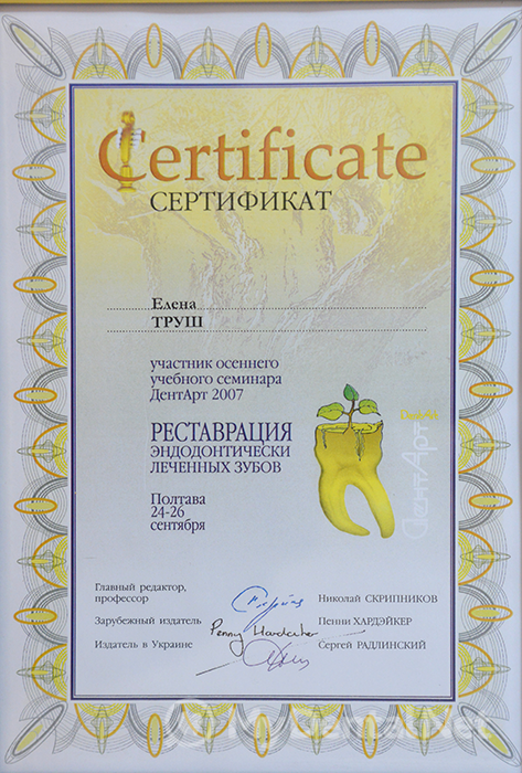 2007 г. Участие в семинаре Дент Арт «Реставрация эндодонтически леченных зубов» г. Полтава